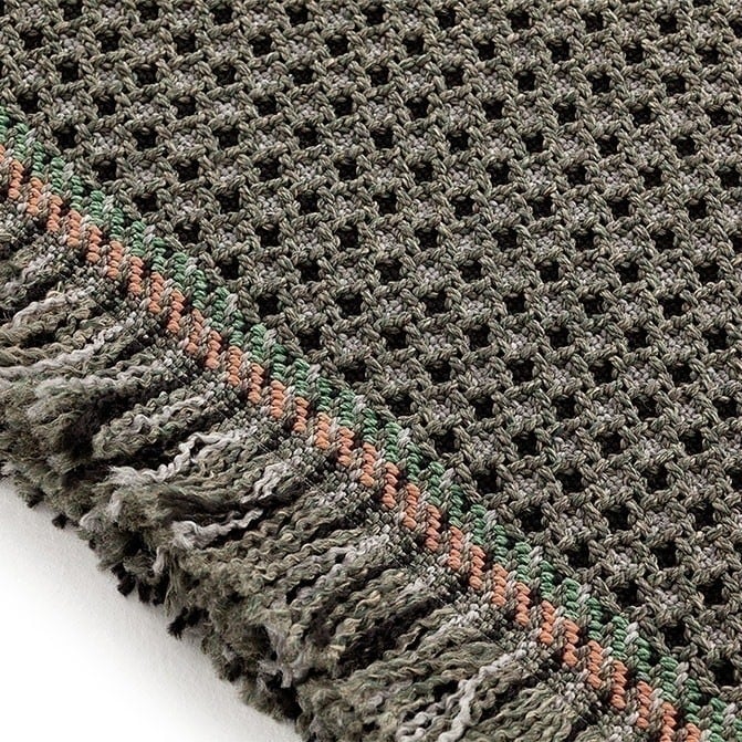 Gofre Green è un tappeto con struttura a nido d'ape realizzato da Gan Rugs. Proviene dalla gamma Garden Layers pensata per interni ed esterni dalla talentuosa designer Patricia Urquiola. Questo tappeto si ispira all'architettura e allo stile di vita associati ai palazzi Mughal. È tessuto con un materiale che garantisce durata preservando un aspetto naturale. Questo tappeto si distingue perché è generosamente provvisto di frange solo su un lato.