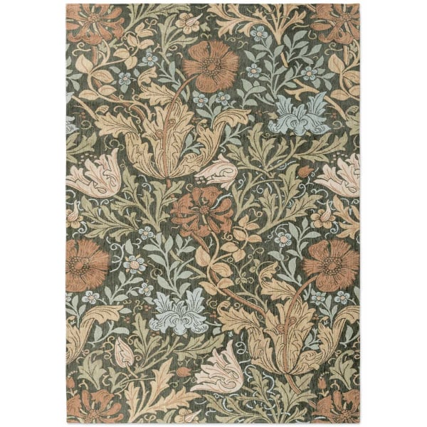 Il tappeto Compton presenta un motivo floreale lussureggiante, tipico dell'estetica Arts & Crafts. Svela una struttura vegetale minuziosa, dove peonie stilizzate e foglie sinuose si intrecciano in perfetta armonia. Il disegno, frutto di una tessitura piatta, rivela una profonda ricchezza grafica. Progettato da Morris & Co, questo modello estende l'eredità di una tradizione tessile dalle composizioni senza tempo.