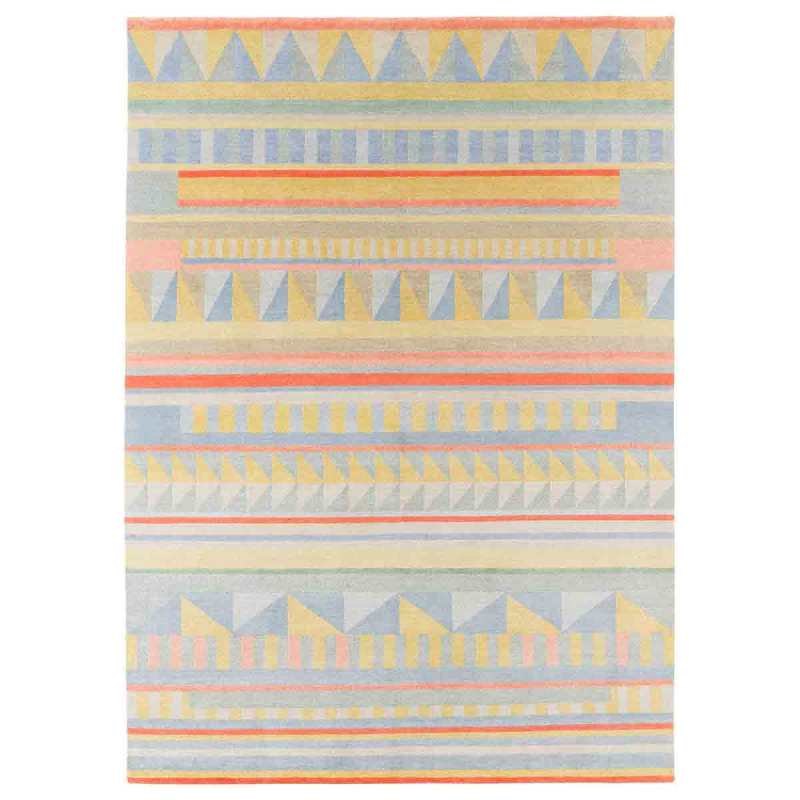 Rakki firma il tappeto Ingibjörg, il cui ritmo grafico si basa su una composizione geometrica tanto complessa quanto armoniosa. Triangoli, rettangoli, quadrati e strisce si susseguono in una trama morbida e vibrante. Una calda lana, mescolata con ortica e seta cinese, conferisce alla tessitura una trama densa e sfumata. Interamente annodato a mano in Nepal, ogni esemplare rivela un know-how ancestrale.