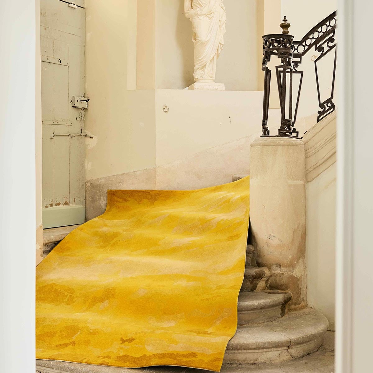Il tappeto Aurora di Serge Lesage evoca una distesa luminosa attraversata da delicate transizioni, ispirate a un lavato. La superficie vibra sotto un preciso lavoro di modulazioni che strutturano lo spazio senza soluzione di continuità. Tuftato a mano, combina lana e fibra di bambù in un motivo denso e morbido. Il disegno si inscrive nel materiale con una profondità silenziosa.