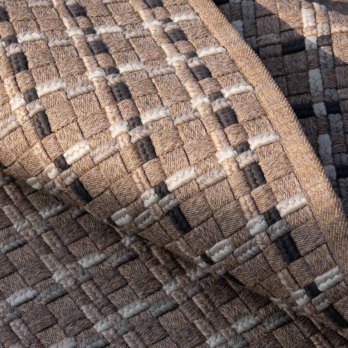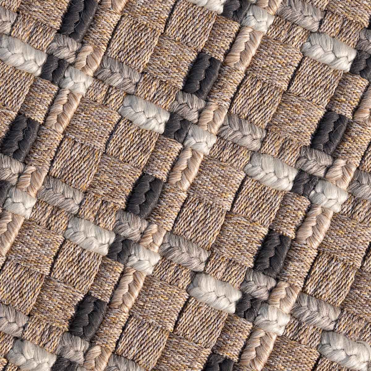 Serge Lesage firma il tappeto Fibra, un pezzo in fibra riciclata interamente tessuto a mano. Il suo disegno geometrico presenta una griglia strutturata in cui linee e ritmi si organizzano con rigore. Cordoni e trecce si intrecciano, creando una variazione di rilievi misurata. La tessitura piatta svela una superficie densa, animata da una struttura sottile e profondamente tattile.