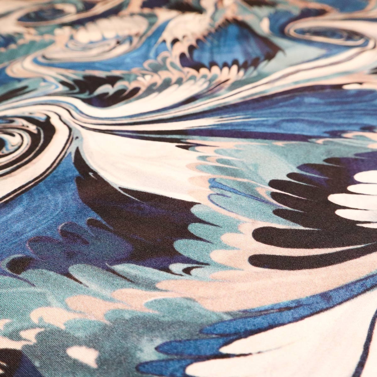 Il tessuto Vogue presenta un motivo sontuoso che ricorda le ricche ore dell'arte della carta marmorizzata ottenuta da colori fluttuanti. Morbida e raffinata, questa stampa su raso di cotone è firmata Jean Paul Gaultier.