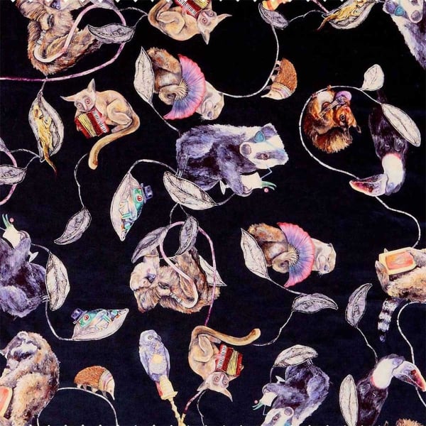 Pappagalli, lontre e procioni rendono Hackney Empire un velluto stravagante che attira immediatamente l'attenzione. Un carnevale di animali pazzi su sfondo nero. Realizzato interamente in cotone di alta qualità, questo modello è resistente e morbido al tatto.