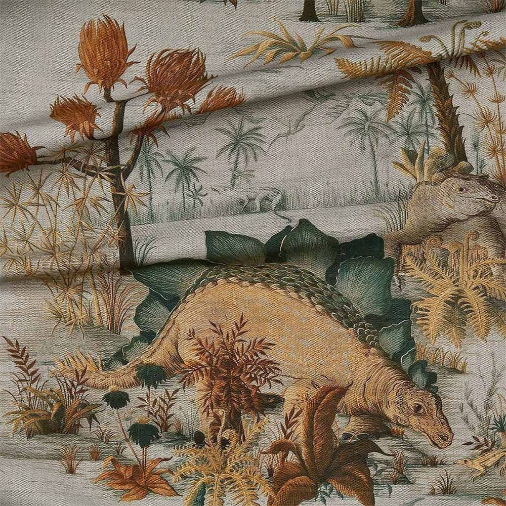 Offrendo uno sguardo alla preistoria, il tessuto Dinosauria illustra una scena in cui i dinosauri esplorano un giardino con una flora diversificata. Il suo motivo vede coesistere stegosauri e triceratopi, creature di un'epoca ormai lontana. Il design è offerto in un sottile mix di toni luminosi e attenuati su un materiale misto lino e cotone.