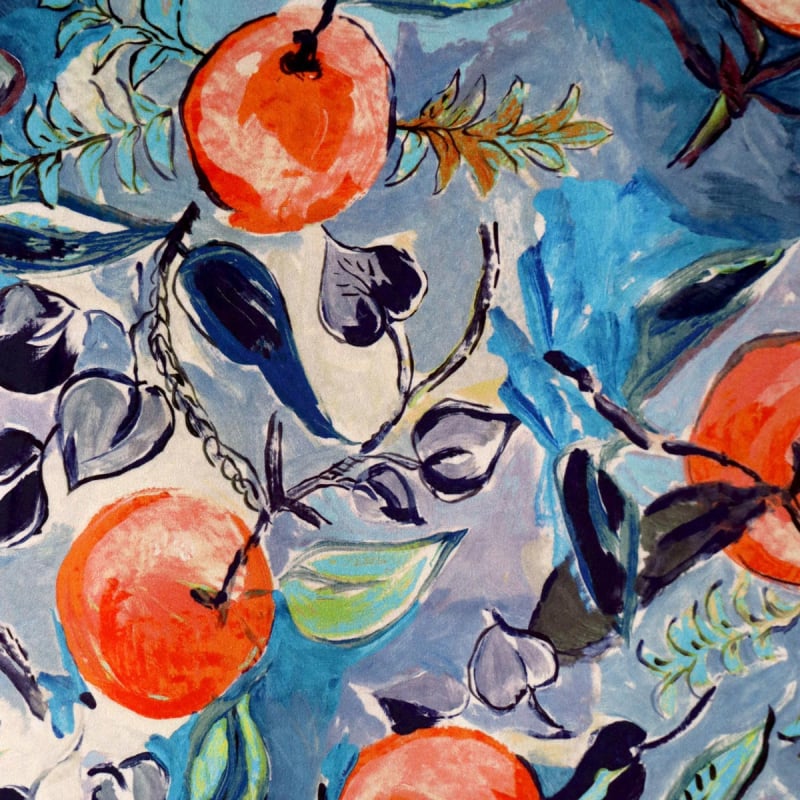 Con il suo motivo vegetale supportato da una grafica dinamica, il velluto Idunn di Lalie Design non ha eguali nel infondere gioia in uno spazio abitativo. Presenta mele piene di colore e piene di sole che aspettano solo di essere raccolte.