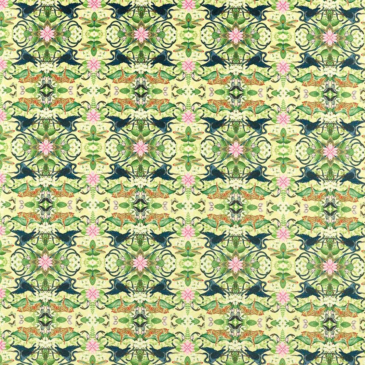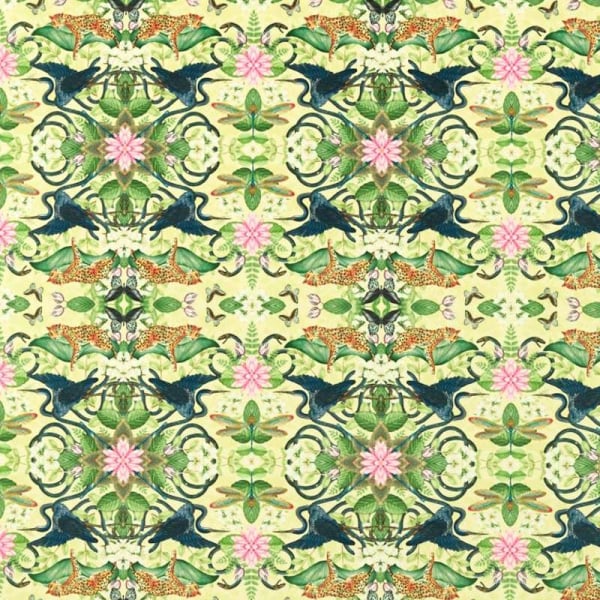 Clarke e Clarke propongono una stampa su velluto dove convivono leopardi e aironi. Wonderlust Tea Story è un modello caleidoscopico che non smette mai di sorprendere. Un viaggio tra il bacino amazzonico e le giungle del Vietnam si svolge davanti ai nostri occhi. Questo modello adorna qualsiasi creazione di ricca fauna selvatica.