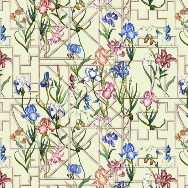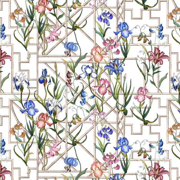 Presentato da Christian Lacroix, il raso di cotone Fretwork Garden è illustrato con un motivo floreale dal tocco geometrico. Bambù e iris sono disegnati in tonalità primaverili, arrampicandosi e ondeggiando su una griglia. Questo disegno viene distribuito su uno sfondo chiaro o scuro a seconda della variazione. Questo tessuto setoso conferisce un tocco artistico audace all'arredamento.