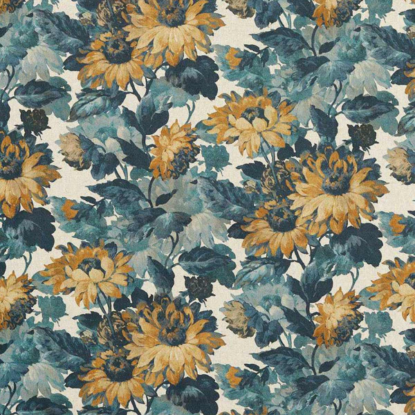Il tessuto Sunforest di Clarke & Clarke presenta un motivo jacquard di fiori e foglie di girasole. Queste, tessute con fibre di viscosa e lino, donano una resa cromatica dall'aspetto vintage. Il modello delizia con la sua profusione floreale e le sue tonalità nostalgiche, oltre al suo tessuto spesso con un drappeggio fluido.