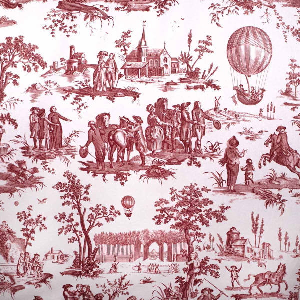 Raccontando il volo del primo pallone a gas, questa toile de Jouy Charles Burger è disponibile in tanti colori. Le diverse scene illustrano scene rurali che rappresentano il percorso percorso dalla mongolfiera, il Campo di Marte e alcuni spettatori accorsi per assistere alla partenza della macchina, poi alla caduta a Gonesse circondati da abitanti spaventati e sconvolti.