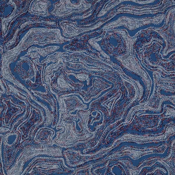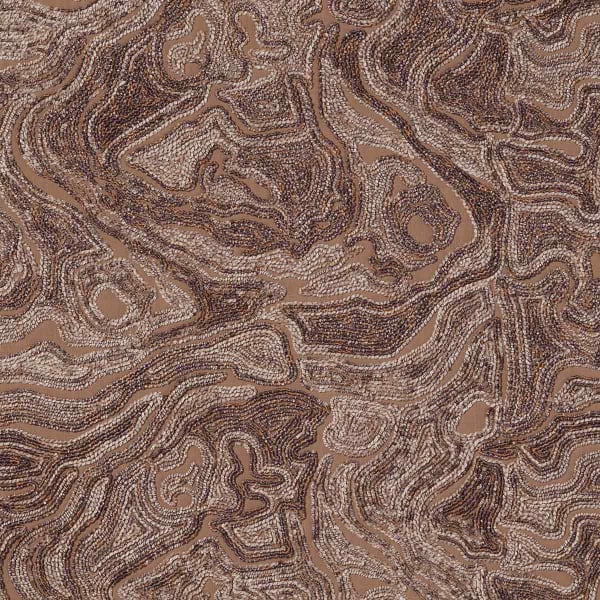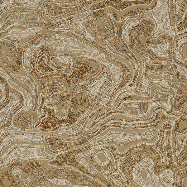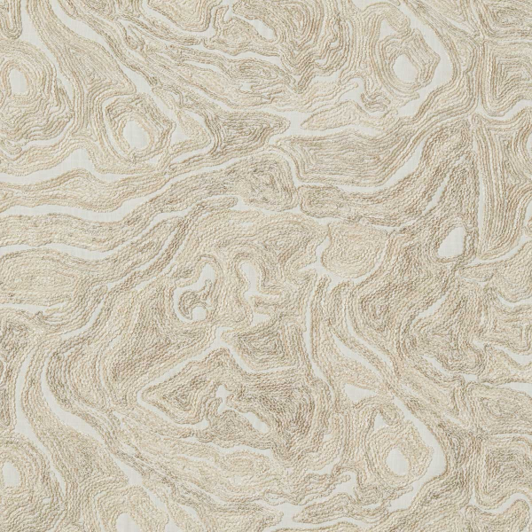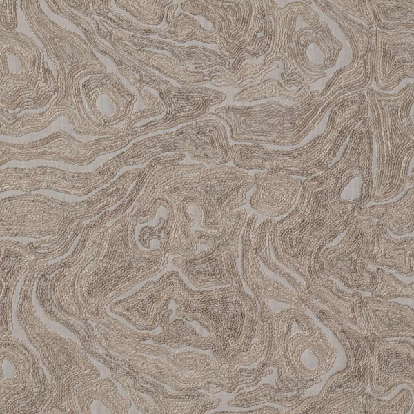 Benu Rumba Recycled è un tessuto ideato da Fischbacher. Linee intrecciate disegnano forme in movimento, simili a sezioni di terreno o strati minerali. Il motivo è realizzato in ricamo denso, conferendo al tessuto una texture in rilievo tattile ed espressiva. Ogni sinuosità sembra risuonare come una traccia del tempo, in una composizione senza centro né confine.