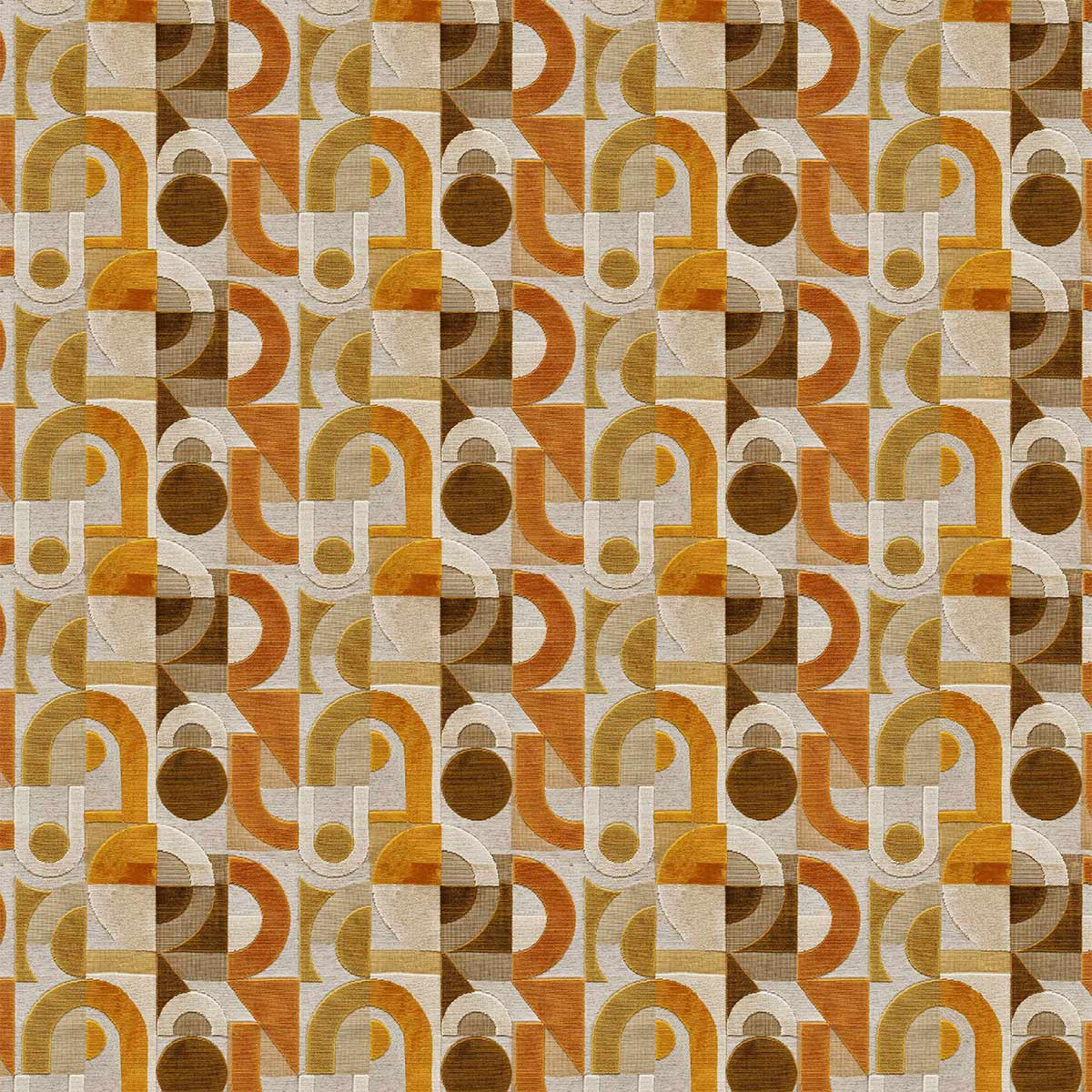 Sul velluto Greta Jour di Casal, il motivo gioca sulla ripetizione delle forme e sulla variazione dei tratti. Il disegno alterna cerchi, archi e pieni intrecciati in una composizione strutturata. L'insieme evoca un gioco grafico tra ombra e luce, volumi e superfici piane. La superficie appare ricamata in rilievo, con trame marcate che sottolineano i contrasti.