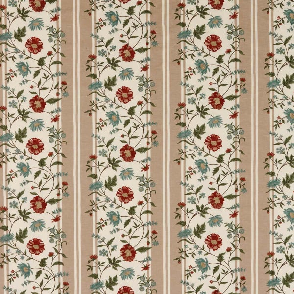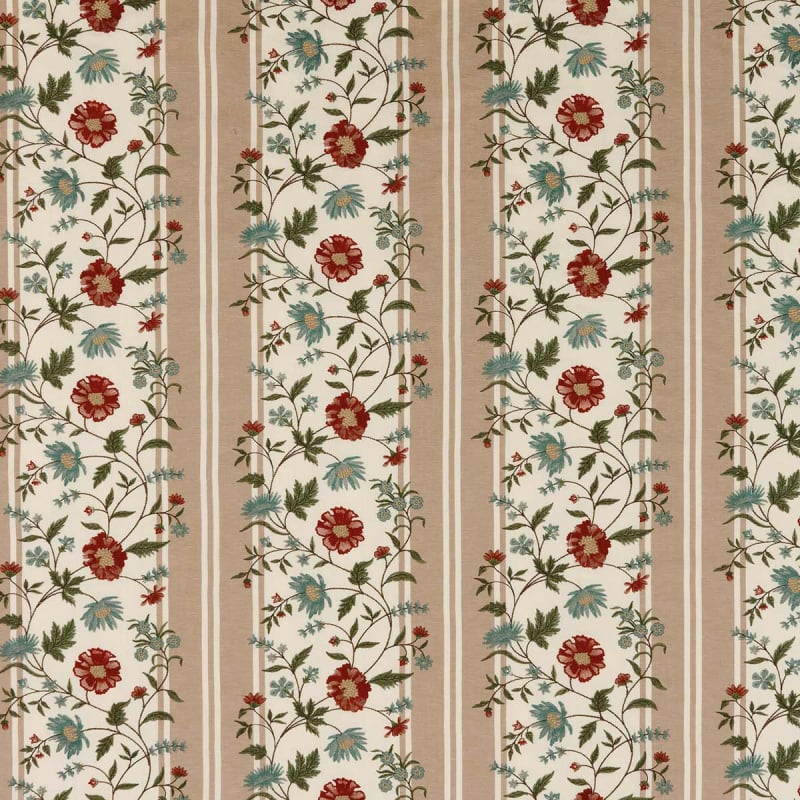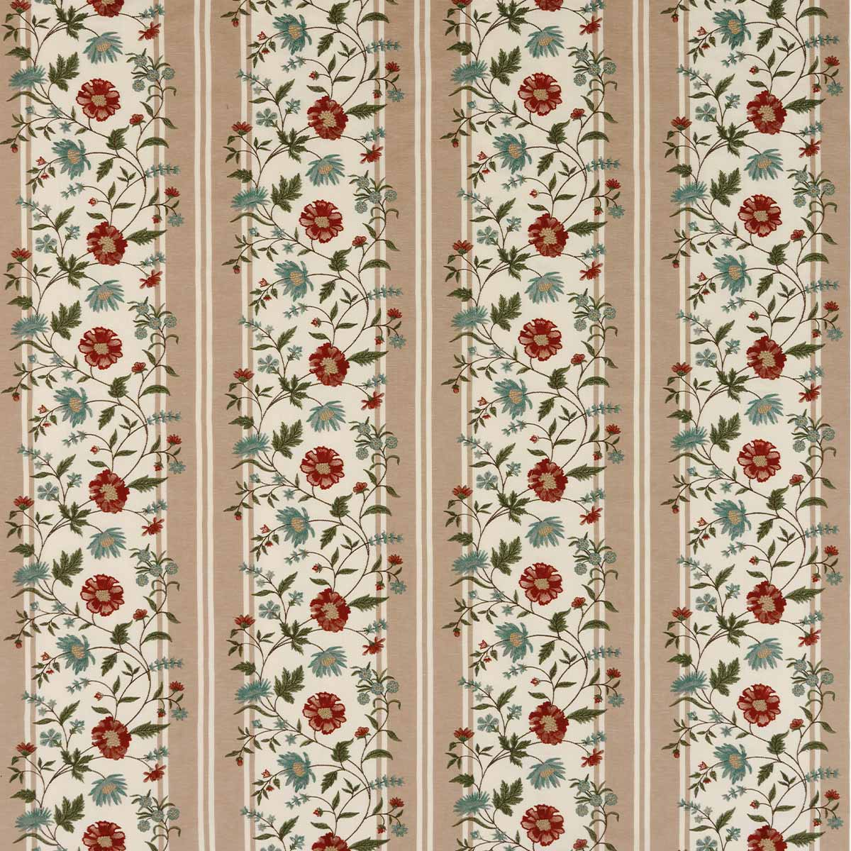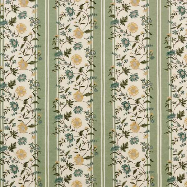 Colmar è un tessuto a righe con motivo floreale firmato Nina Campbell. Il disegno è composto da steli flessibili carichi di corolle fiorite e piccole foglie dentellate. Ogni striscia verticale incornicia i mazzi rampicanti separati da intervalli uniti che strutturano l'insieme. Le curve vegetali conferiscono una sensazione di movimento continuo, in uno stile decorativo classico con accenti campestri.