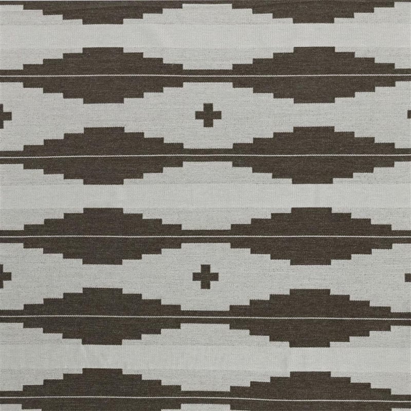 Il tessuto Keyah traspone un linguaggio visivo, ispirato al deserto americano, in un motivo grafico di grande rigore. Le figure a gradini sono allineate orizzontalmente, bilanciate da croci centrali. La composizione geometrica gioca sull'alternanza di zone chiare e scure. Progettata da Designers Guild a partire da una miscela di fibre, questa creazione rivela una texture strutturata.
