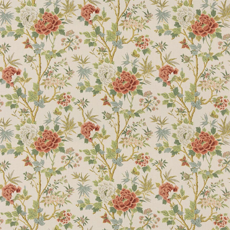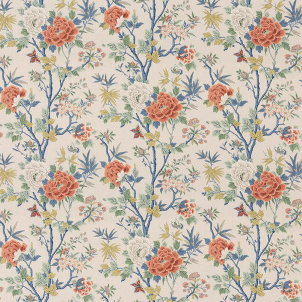 Il tessuto Canton presenta un lussureggiante motivo floreale, ispirato alle arti decorative asiatiche. Steli sinuosi si ergono con flessibilità, portando peonie dai contorni netti circondate da un delicato fogliame. Ogni dettaglio del disegno compone una struttura densa dall'equilibrio controllato. Firmato GP & J Baker, questo tessuto evoca antichi giardini e poesia botanica.