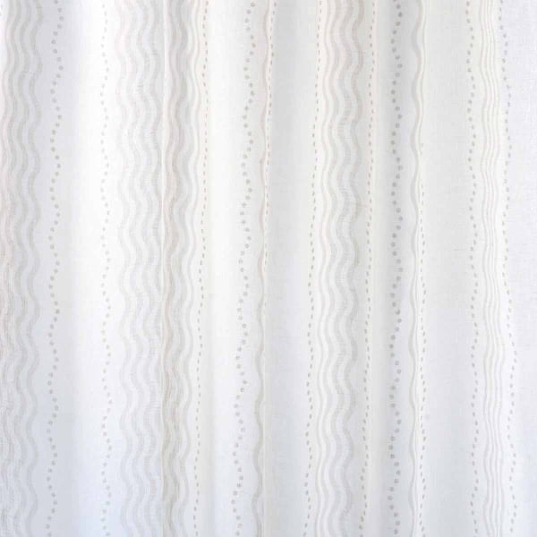 Schumacher presenta Margot Linen Sheer, un tessuto con un delicato motivo geometrico che traccia una partitura discreta su tutta la superficie. Strisce ondulate punteggiate da pois, disposte con regolarità, infondono un movimento morbido e cadenzato. Il lino fine conferisce al velo una trama leggera, quasi ariosa. La grande larghezza accentua la fluidità di questo tessuto luminoso.