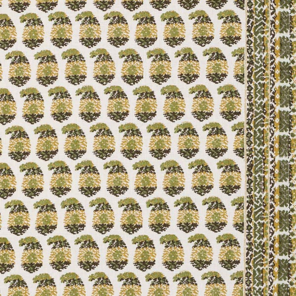 Schumacher presenta Terry, un tessuto scandito da un motivo geometrico dalle linee ripetute, al contempo strutturate e vibranti. Il disegno, formato da cachemire stilizzati e da un bordo minuziosamente lavorato, trae ispirazione da un documento antico. Ogni dettaglio, riattivato con precisione, anima la superficie. La trama del lino, naturale e vivace, conferisce all'insieme una presenza tattile.