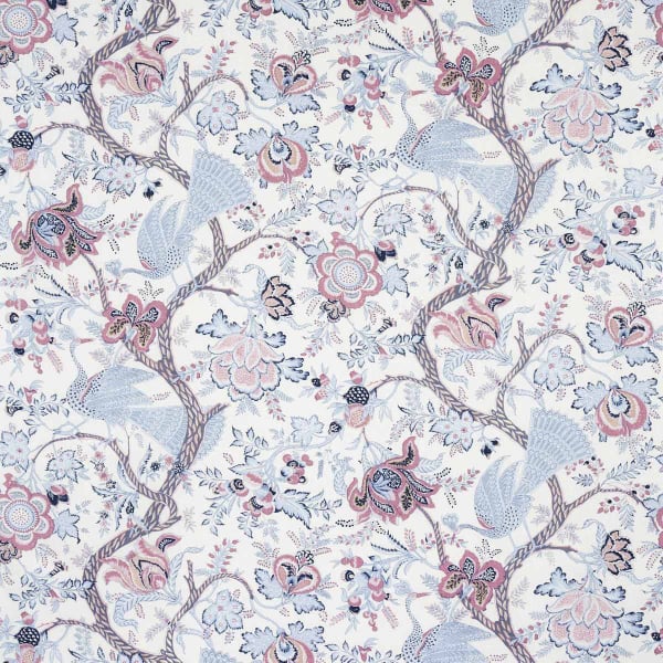 Con Aveline Linen, Schumacher rivela un tessuto eccezionale, in cui sboccia un motivo fantasioso con accenti lilla. Dei pavoni dal portamento maestoso si insinuano tra le volute di una vite fiorita che disegna un paesaggio vibrante di vita. Realizzato interamente in lino, rende omaggio ai tessuti indiani del XIX secolo. La composizione aggraziata e l'ispirazione storica conferiscono una presenza unica.