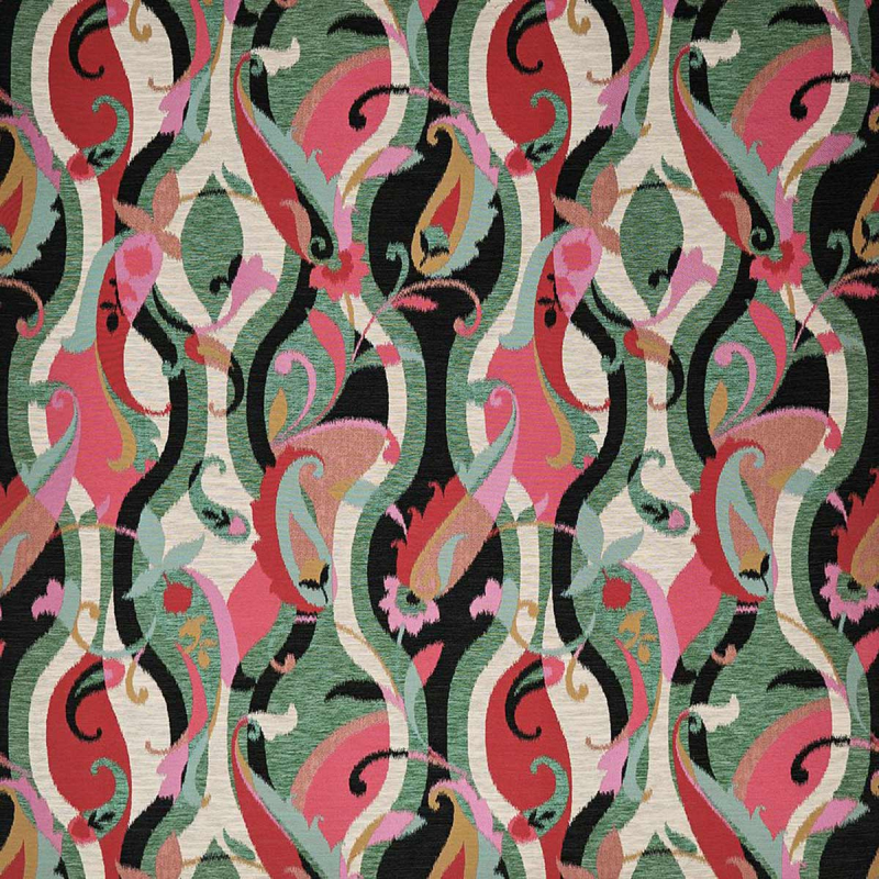 Osborne and Little presenta il tessuto Castillo, un jacquard denso in cui si intrecciano volute floreali e sinuosità geometriche. Il motivo cachemire, stilizzato con audacia, traccia arabeschi contemporanei. La sua trama in rilievo richiama la finezza di un intarsio lavorato, tra intarsi precisi ed effetti materici. Questo tessuto dispiega una presenza vibrante e coniuga ornamento e grafica.