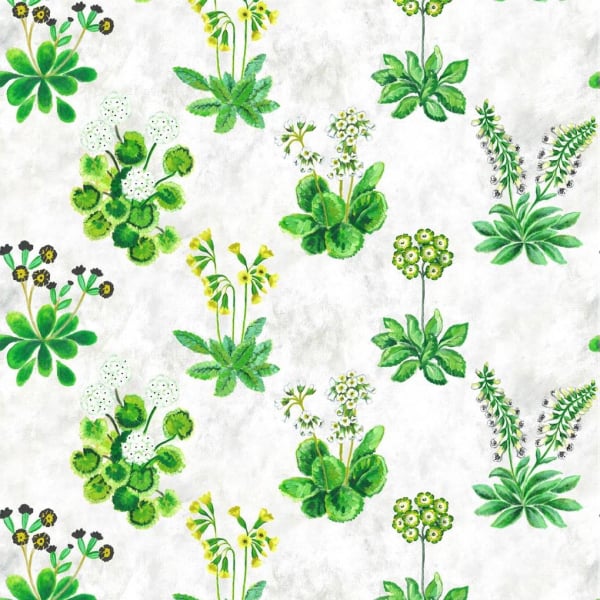 Su uno sfondo chiaro, il tessuto Primevère di Designers Guild evoca un erbario delicatamente ordinato. Piante intere fioriscono in semina regolare, mescolando rosette carnose, steli slanciati e infiorescenze sferiche. Le primule si affiancano a mazzi di fiori di campo, punteggiati da campanule e fiorellini stellati. Il disegno ad acquerello, con contorni morbidi e sfumature sottili, sottolinea la trama vivace di ogni foglia.
