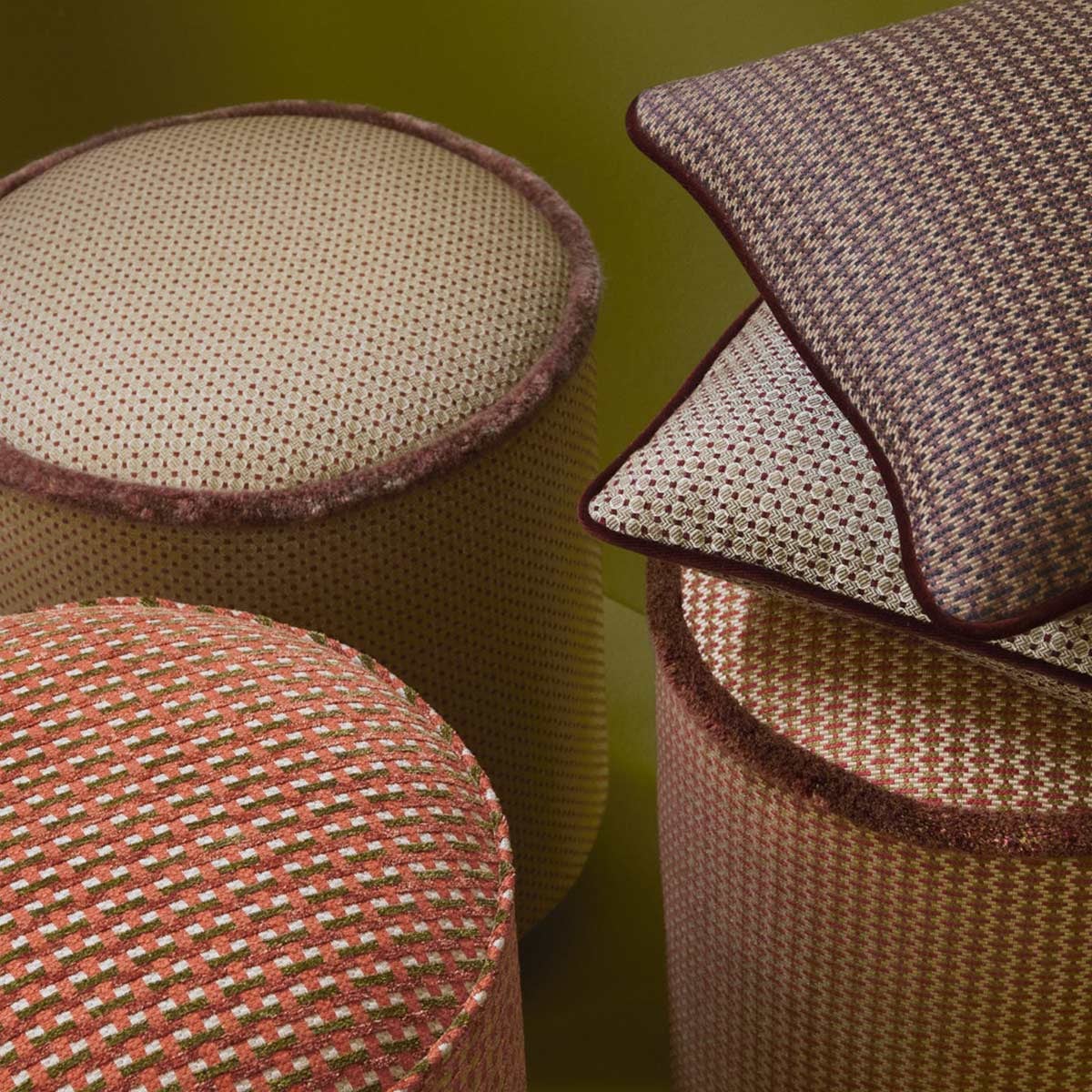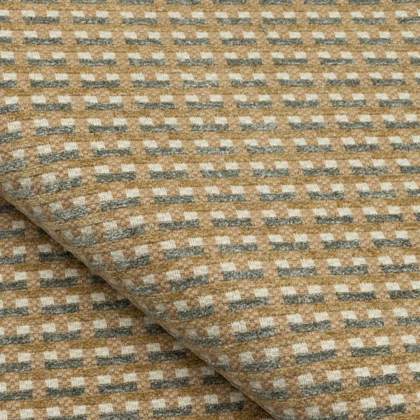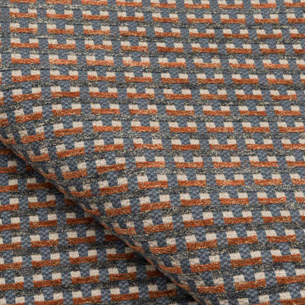 Il tessuto Tambo di Nobilis presenta un motivo geometrico regolare, composto da piccoli quadri in rilievo. Il disegno si compone dalla sovrapposizione ritmata di strisce dalle tonalità mélange, che creano un sottile gioco ottico. La texture, al contempo densa e vibrante, rivela la presenza di cotone e lino. L’insieme evoca una modernità ovattata, quasi tattile.