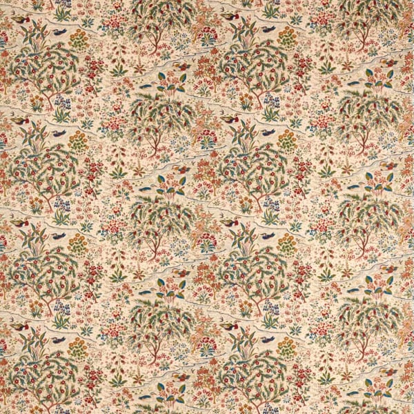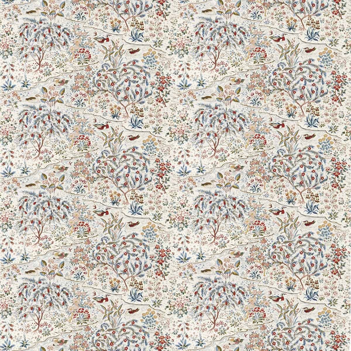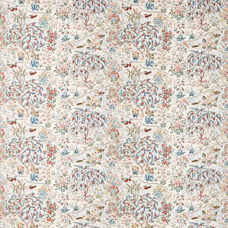 Il tessuto Moat Birds presenta un motivo figurativo tratto da una xilografia conservata negli archivi di Sanderson. Nel letto di un fiume tortuoso, le anatre scivolano tra fogliame, steli e petali. I frutti intervallano questa composizione botanica con una presenza discreta. Il cotone e il lino uniscono le loro fibre naturali in una texture morbida e densa al tatto.