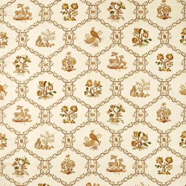 Con Partridge Pear, Sanderson compone una scena minuziosa, al contempo densa e ordinata. Questo tessuto mette in risalto un reticolo ottagonale popolato da cervi, uccelli, scoiattoli e alberi stilizzati. Il motivo, ispirato alle tradizioni giacobine, si declina in un affresco vegetale e faunistico dal grafismo rigoroso. Ogni medaglione ricamato sembra catturare un frammento di natura cristallizzato nel tempo.