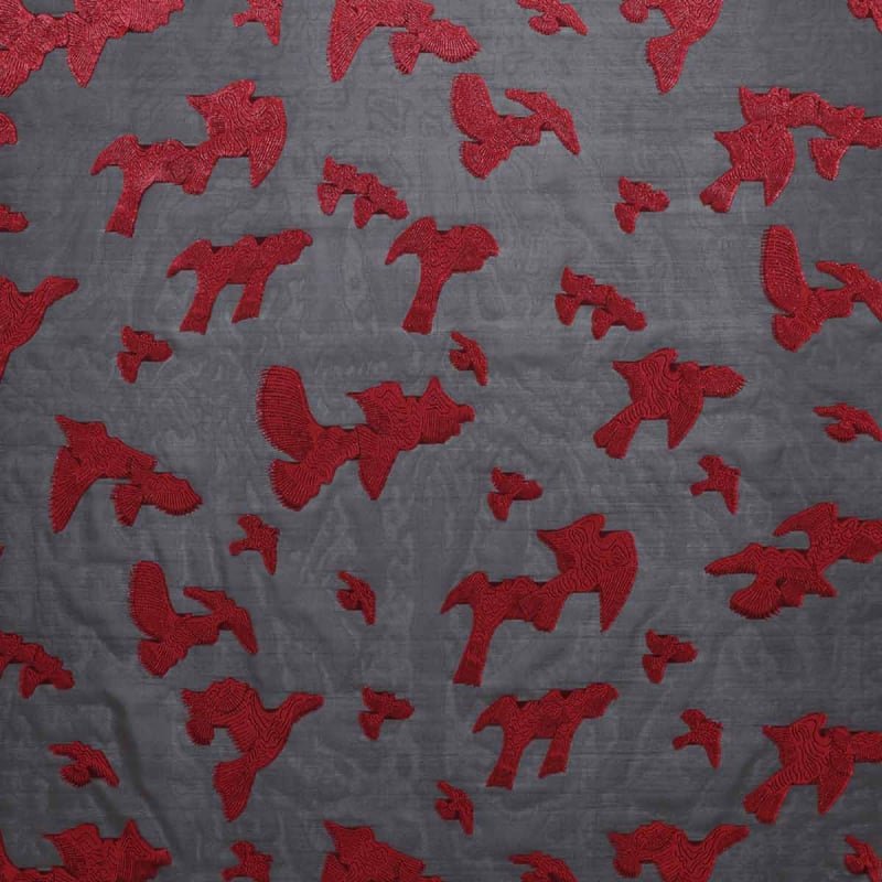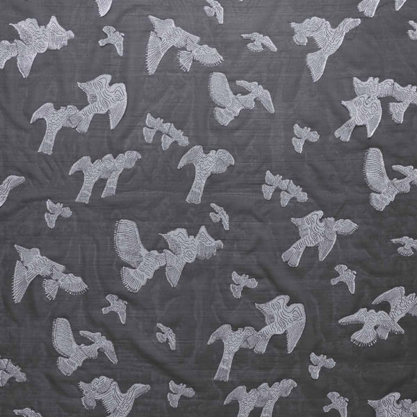 Il tessuto Chara di Sahco sfoggia un motivo geometrico in cui sagome di uccelli stilizzate si inseriscono in una trama regolare. Il disegno crea un ritmo visivo strutturato e arioso attraverso forme angolari e ali spalancate. Il contorno preciso di ogni figura rivela una sottile lavorazione della trama. In parte composto da fibre riciclate, questo tessuto riflette un approccio attento ai materiali.
