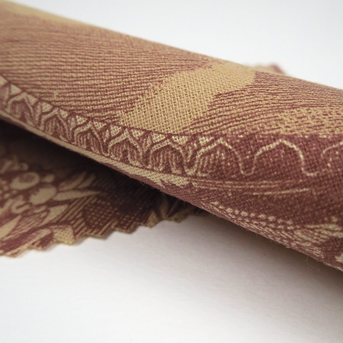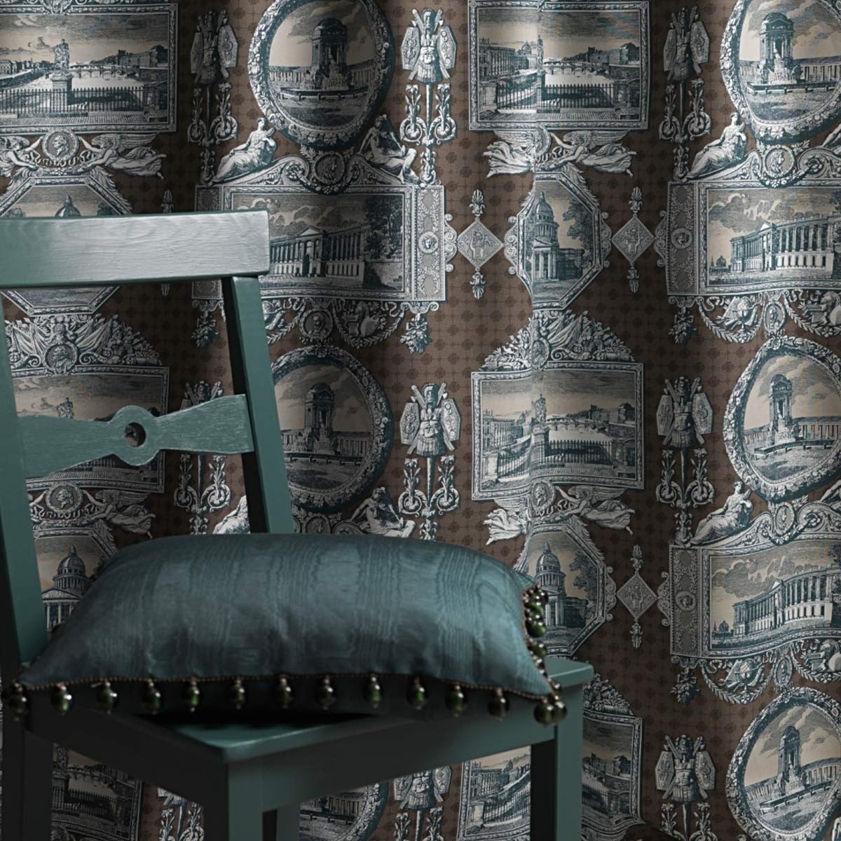 Una stampa su cotone complessa e dettagliata che rappresenta i monumenti di Parigi in medaglioni in stile Impero. Originariamente disegnato dall'architetto Hippolyte Le Bas nel 1818, il motivo è ora disponibile su questo sontuoso tessuto al metro firmato Marvic Textiles.