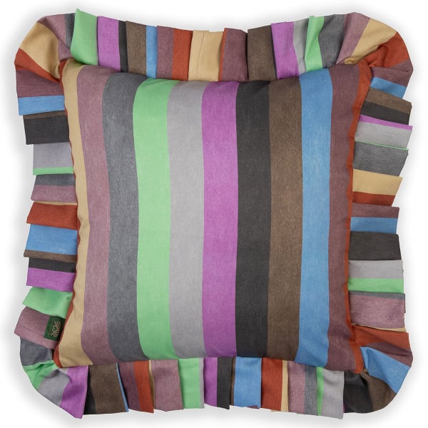 The Iridis Stripe cushion celebrates the brilliance of colour in a geometric dance. The stripes, in a profusion of faded neon shades, evoke the rainbow, in homage to the goddess Iris. Made from cotton sateen, this square design has a delicate texture to the touch. Multicoloured ruffles frame this vibrant tableau, adding a touch of fun and fantasy to the space.