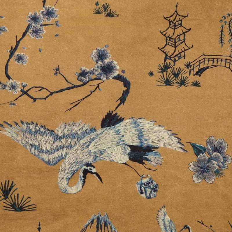 Apportez une touche d'exotisme à votre intérieur avec le tissu Food Babies. Ce tissu met en scène des plantes exotiques, des pagodes et des cigognes apportant des paniers de gourmandises. Poodle and Blonde propose ce tissu en lin et coton dans des tons doux.