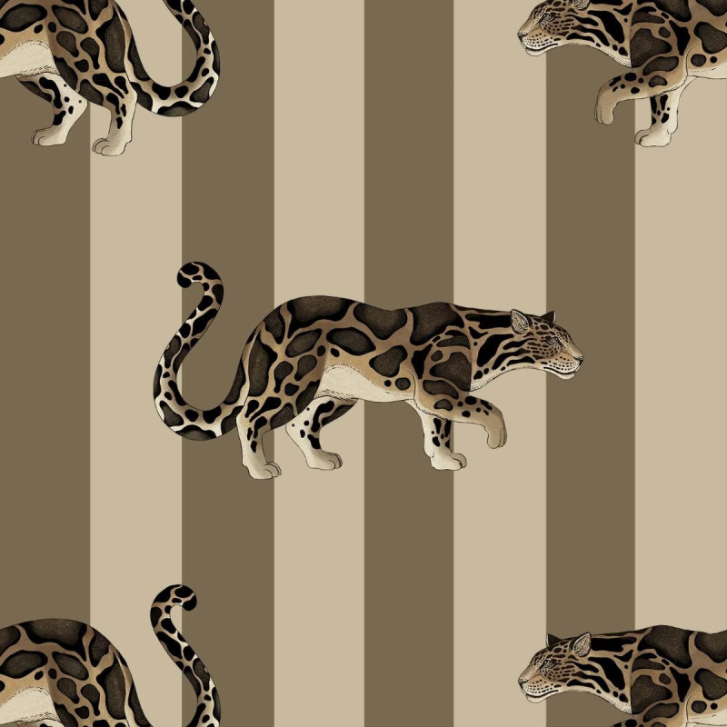 Le motif panoramique Prowl de House of Hackney s'inspire de l'Art déco. Il met en scène des jaguars aux couleurs naturelles sur un fond de rayures verticales classiques, apportant une touche d'exotisme aux espaces de vie.