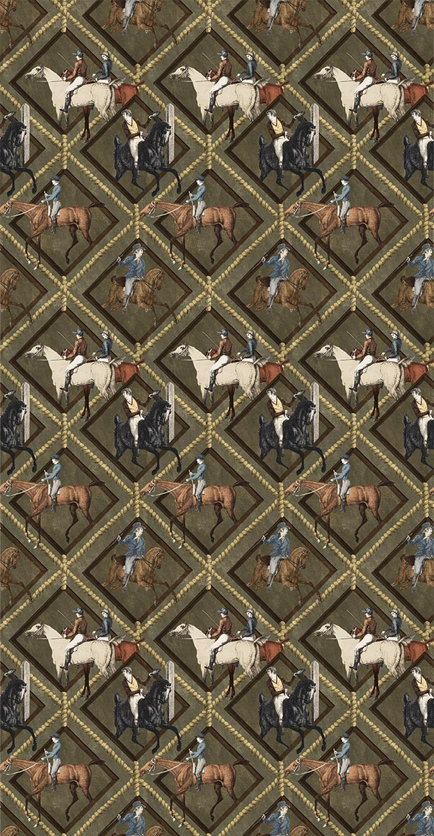 Le motif du panneau Gymkhana met en scène des cavaliers passionnés d'équitation. Ils sont entourés de cadres en forme de losange et de cordes nouées sur un fond uni. Cette décoration panoramique de Mindthegap rend hommage à ce sport emblématique des Anglais.