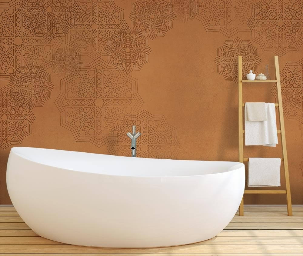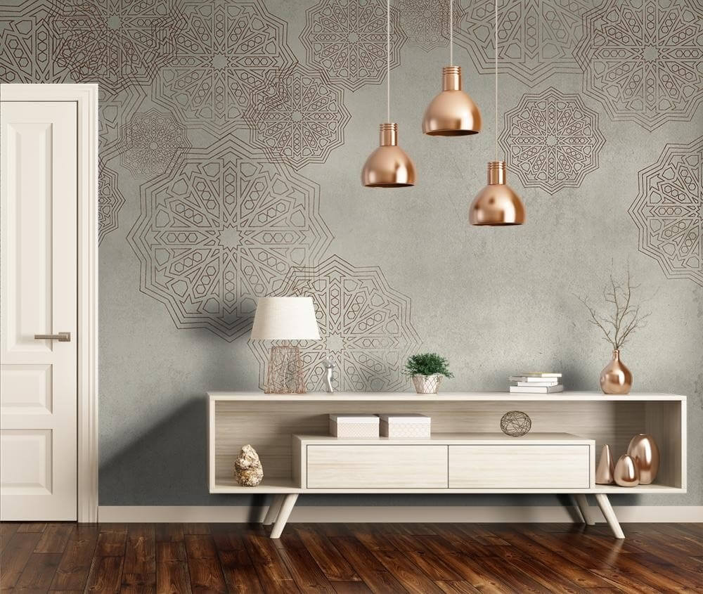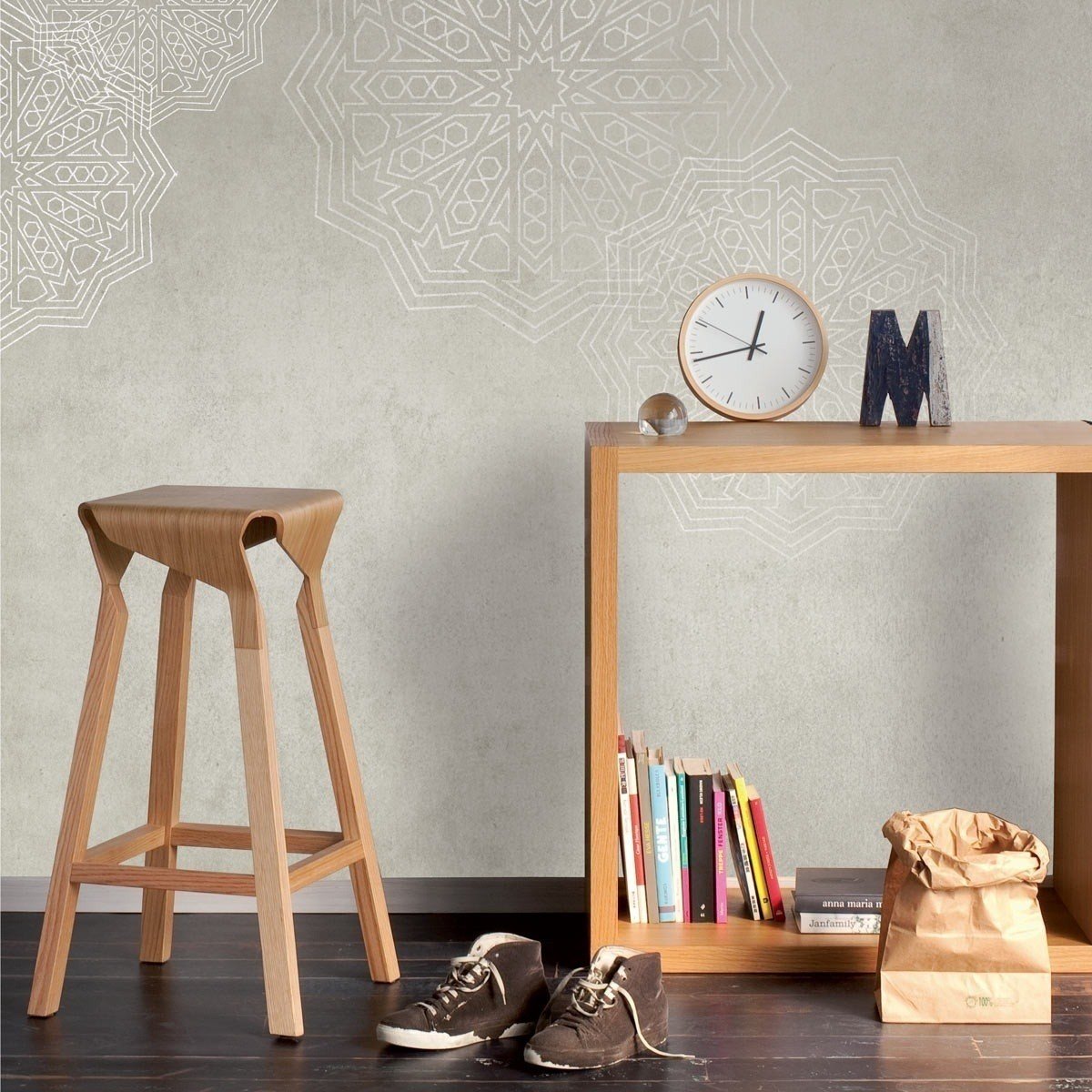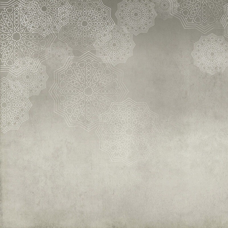 Papier peint Tres Tintas, Alandalus arbore un motif s'inspirant des mosaïques andalouses, tout en dégradés et enchevêtrements.  Les ornements géométriques évanescents se supperposent et apportent de la profondeur à l'ensemble.