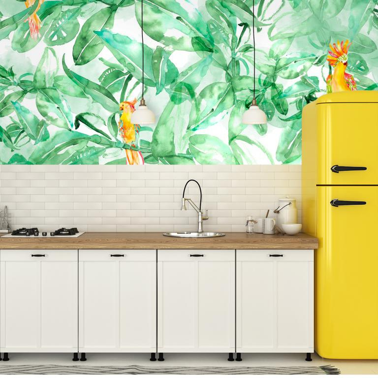 Parrots, with their crest on show and orange plumage, sit in a dense jungle with a watercolour paint effect. Find Parrots is a tropical wallpaper panel designed by Lara Costafreda for Coordonné.