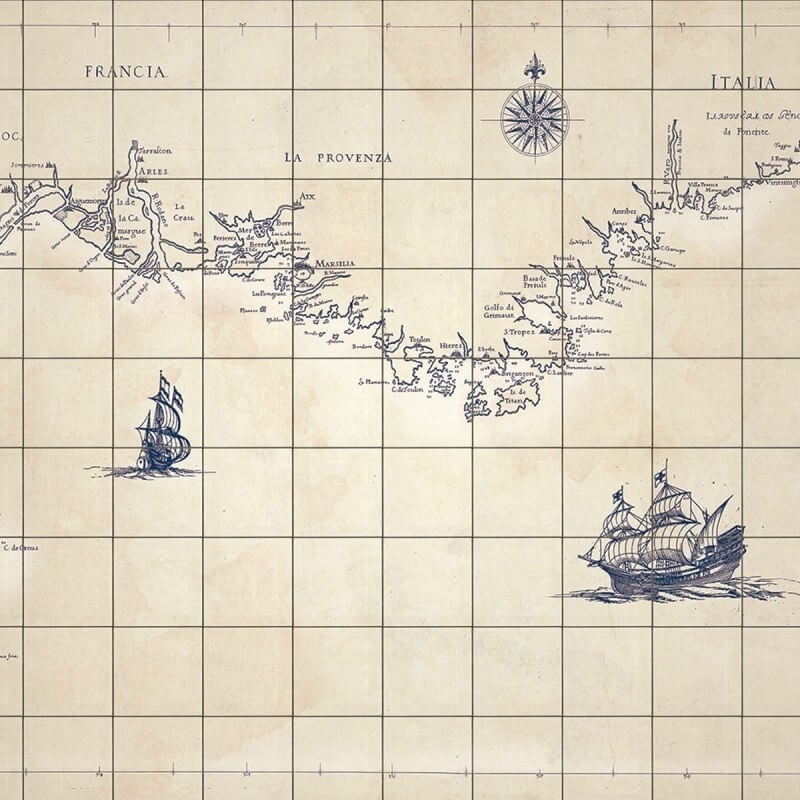 Ce panneau Carrelage Marin créé par le designer espagnol Lázaro Rosa Violán pour la maison Tres Tintas est une carte de la mer Méditerranée. Imitant les cartes anciennes, le tracé de la côte se détache en bleu marine sur un fond couleur parchemin. Deux navires et une boussole agrémentent l'ensemble.