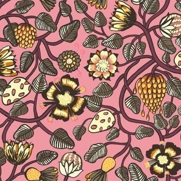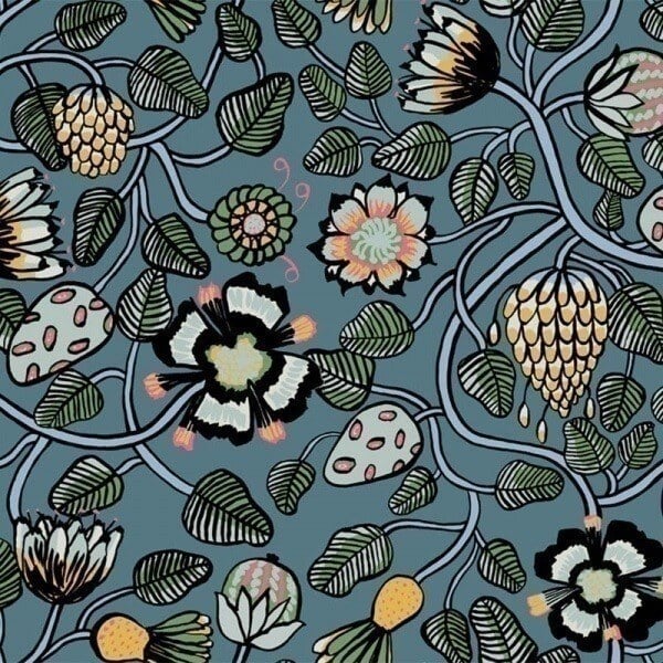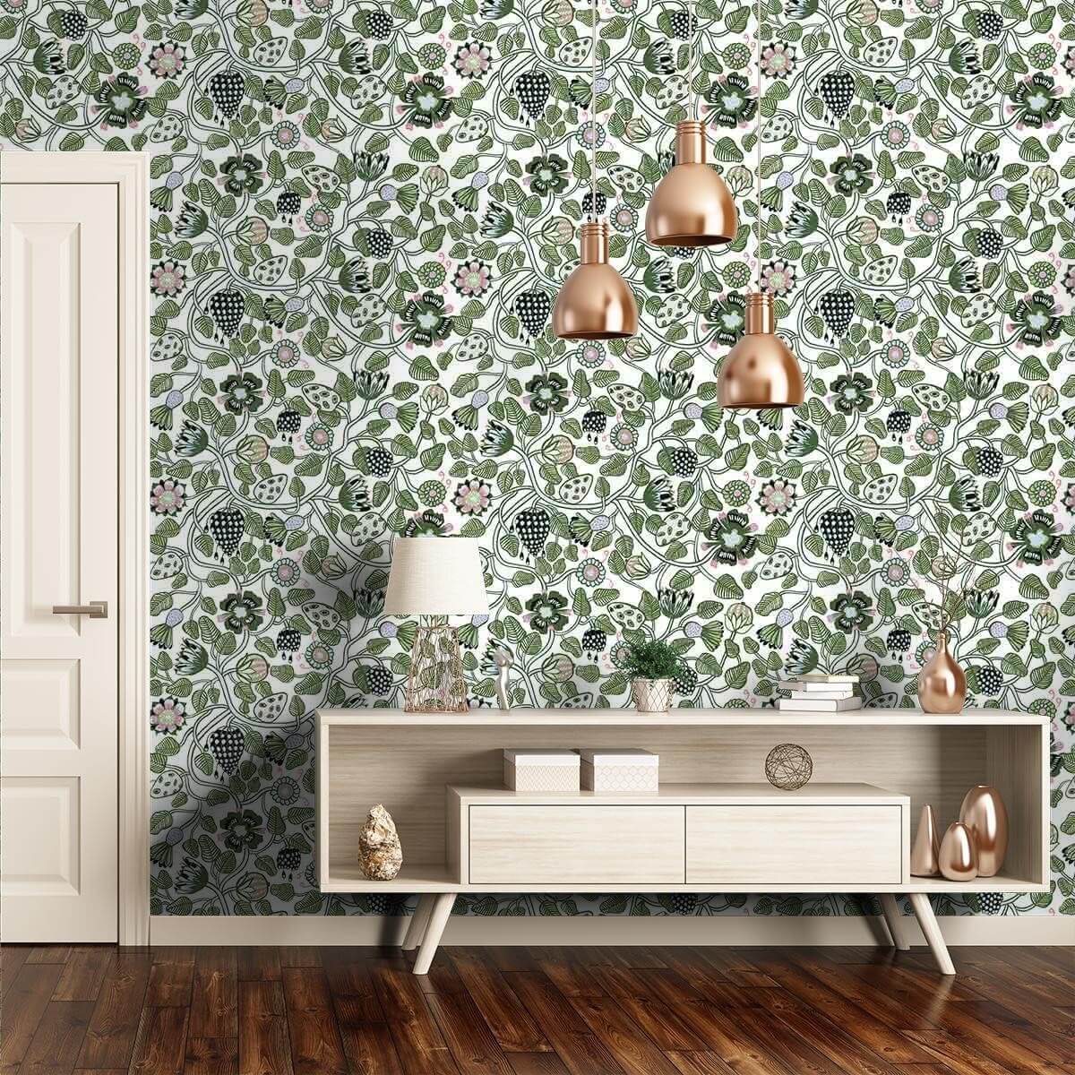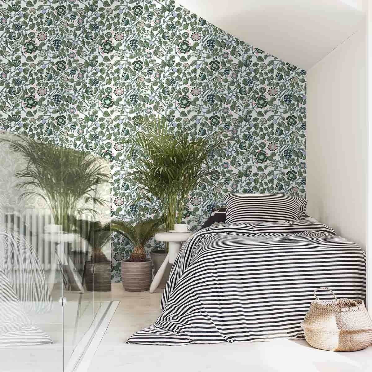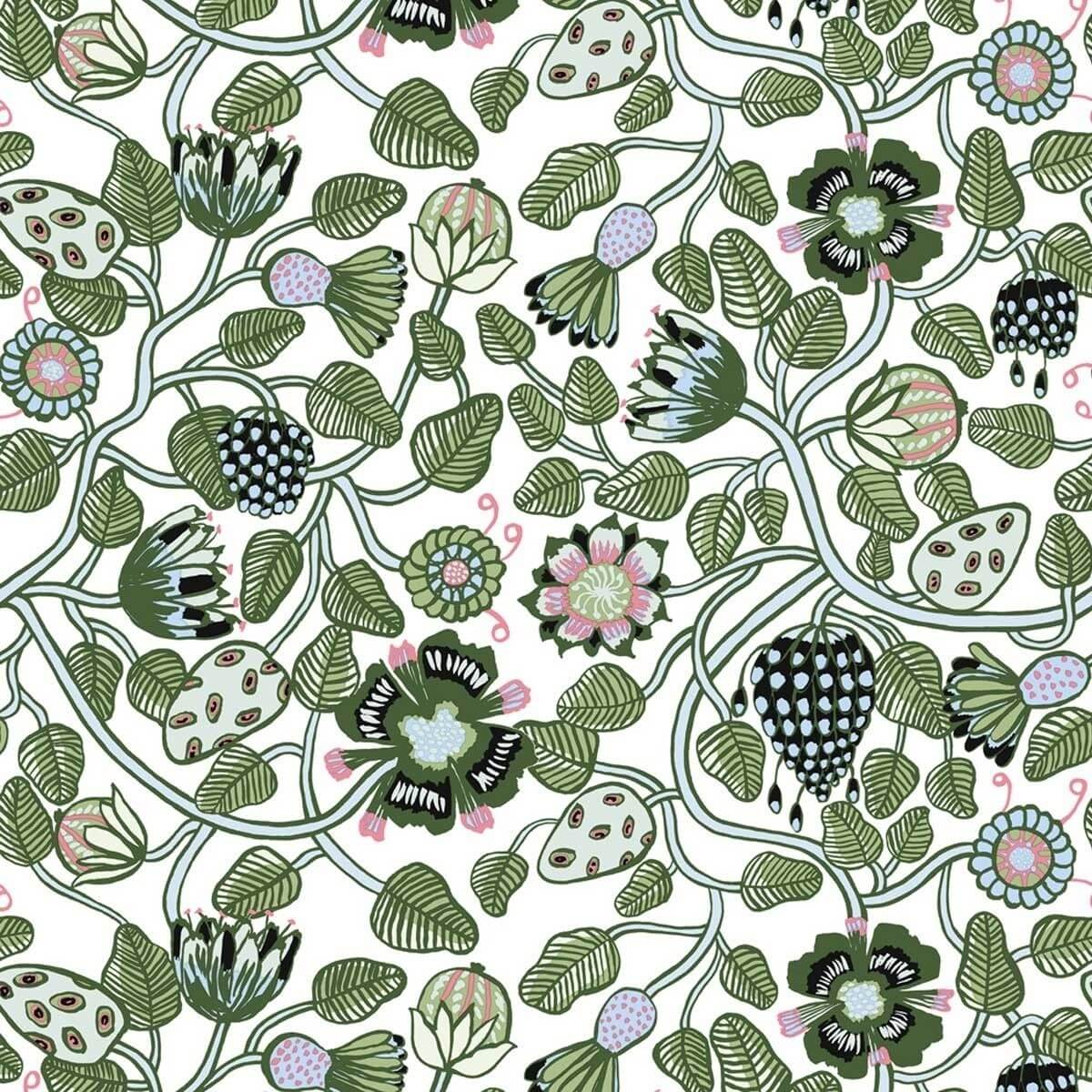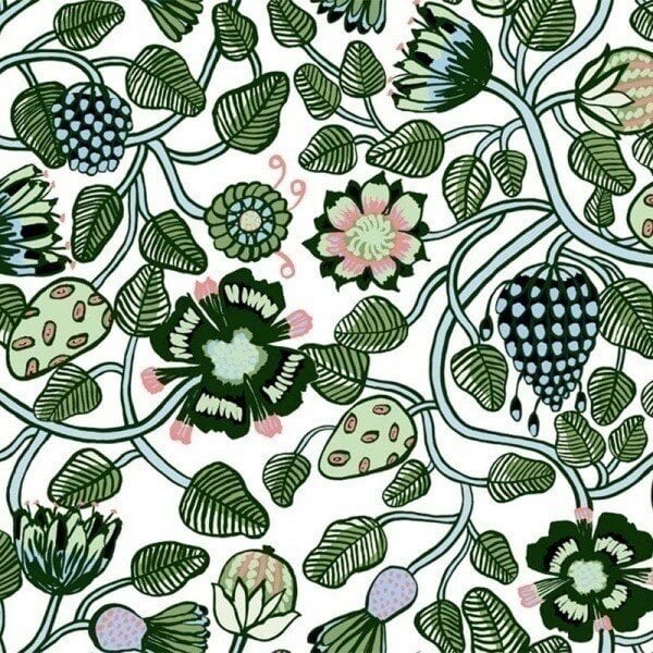 Pieni Tiara est un papier peint au thème floral désigné par Erji Hirvi pour Marinekko. Il affiche sur son motif des branches feuillues où poussent plusieurs sortes de fruits. De jolies fleurs s'épanouissent aux extrémités des tiges et complètent ce tableau verdoyant. Les couleurs atténuées de ce modèle lui apportent une note de douceur.