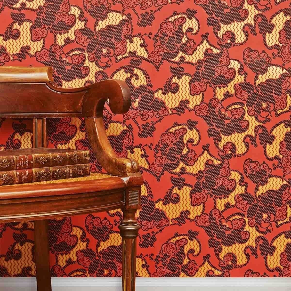 Le papier peint Deauville présente des grappes de fleurs stylisées réalisées grâce à un assemblage de petites rayures discrètes. Ce dessin est mis en contraste sur des zigzags verticaux, un des motifs iconiques d'Isidore Leroy. Une finition brillante ainsi que le côté ornemental de l'ensemble lui confèrent une certaine élégance.