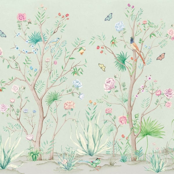 Le panneau Peonies de Coordonné met à l'honneur des pivoines arbustives de l'Orient. Une large variété de fleurs y pousse sur des arbres atypiques, imaginés par les designers de la marque. Des oiseaux posés au sol et sur les branches attendent de se gorger de fruits. Des papillons multicolores virevoltent dans les airs en quête de pollen.