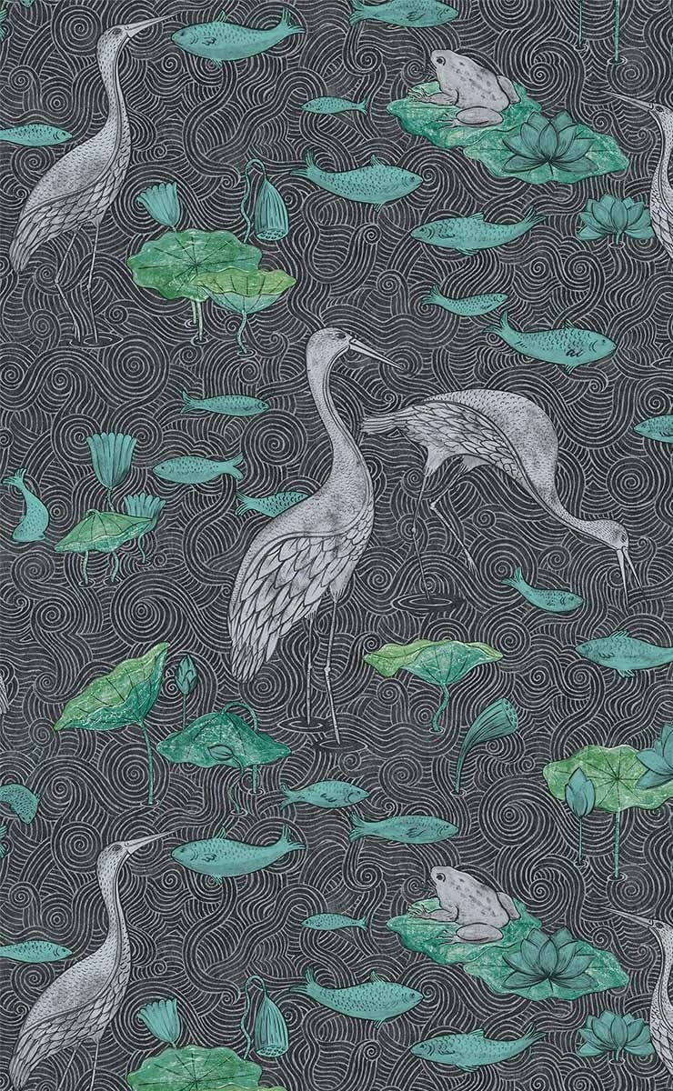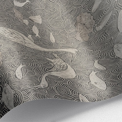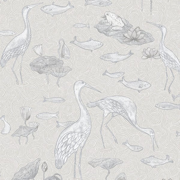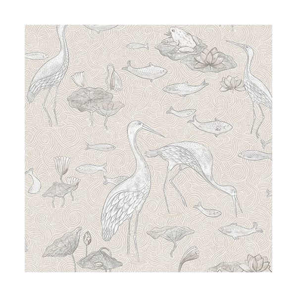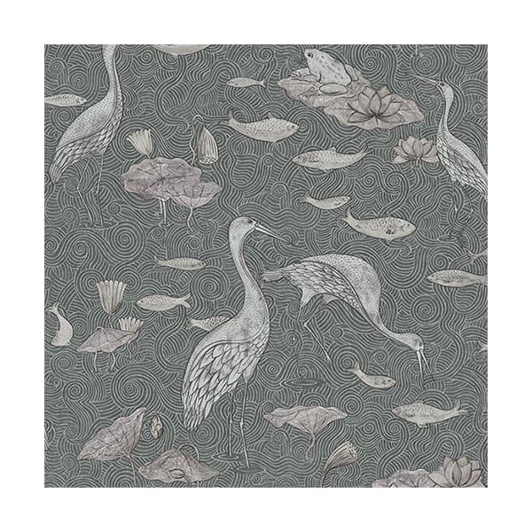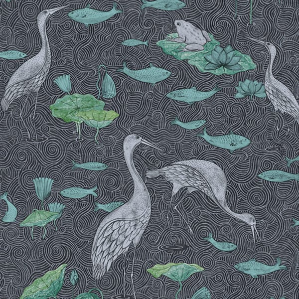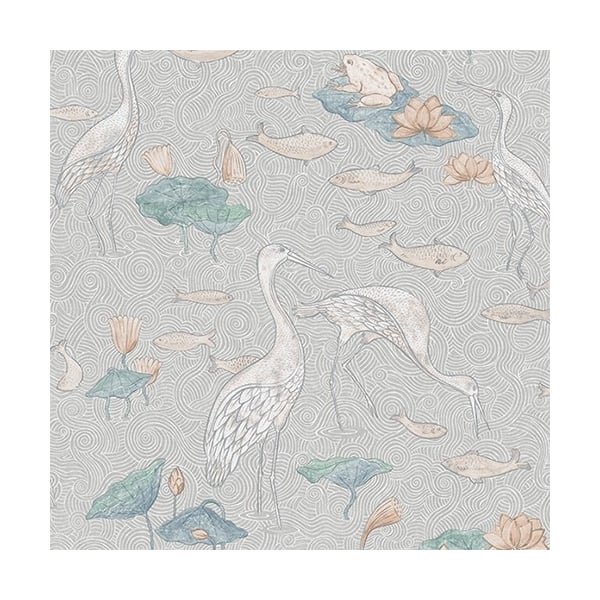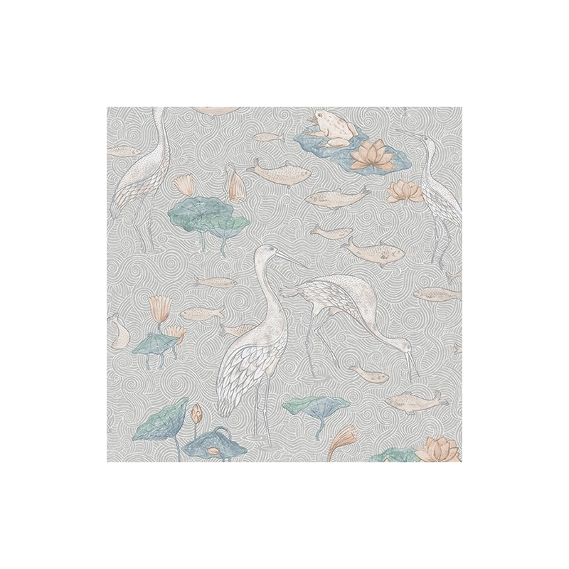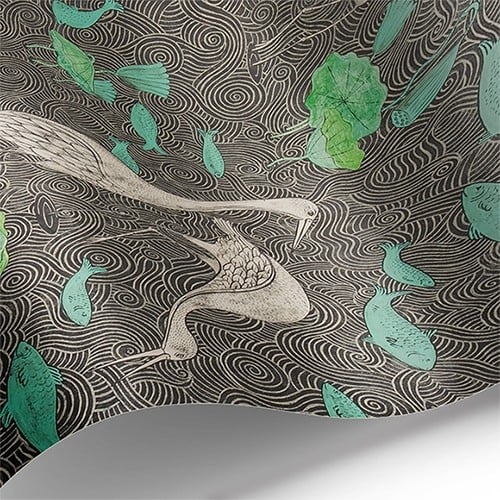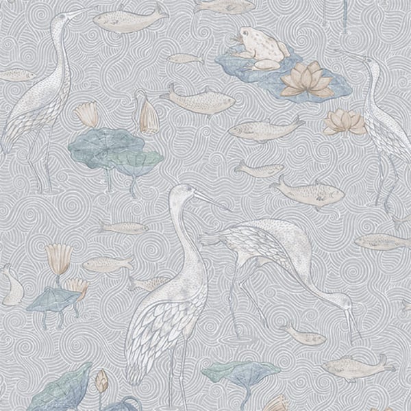 Le papier peint Enchanted River illustre la scène fascinante d'une rivière peuplée de hérons, de crapauds et de poissons. Avec ses lignes sinueuses, la surface de l'eau est stylisée à la manière des estampes japonaises. Des nénuphars complètent la composition, insufflant une ambiance sereine et décontractée.