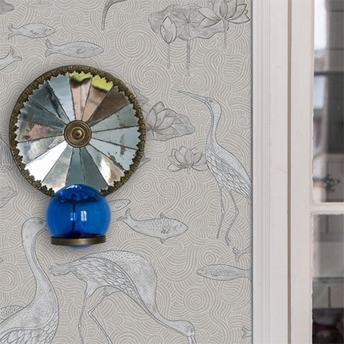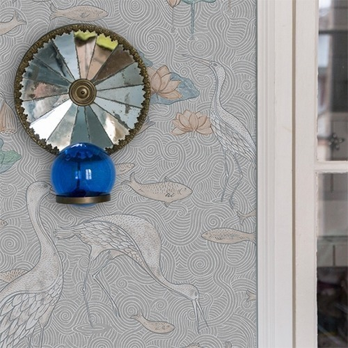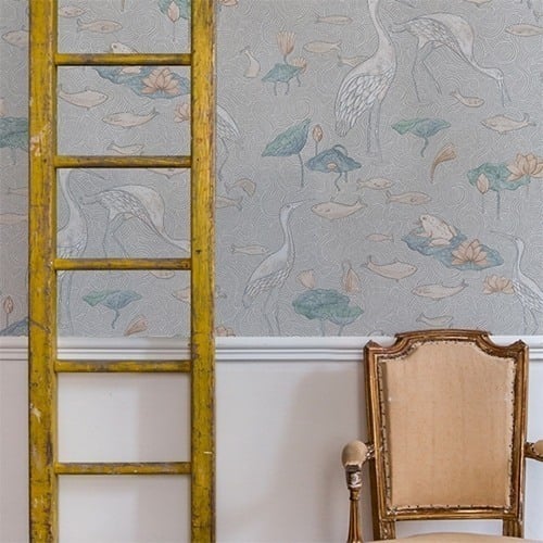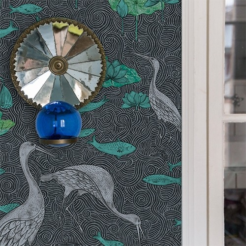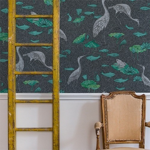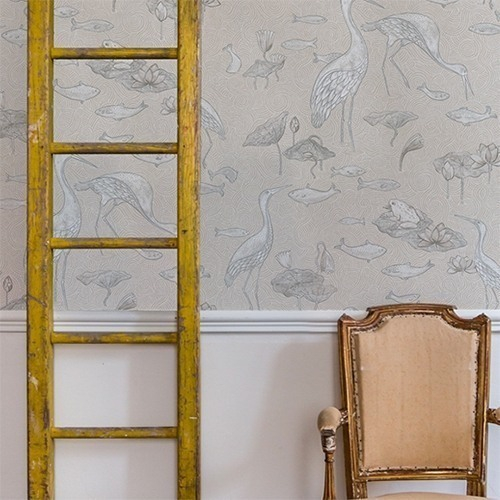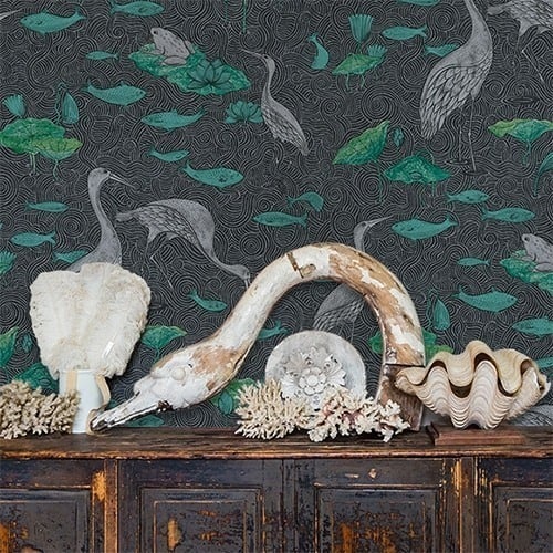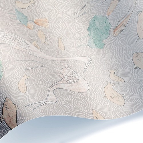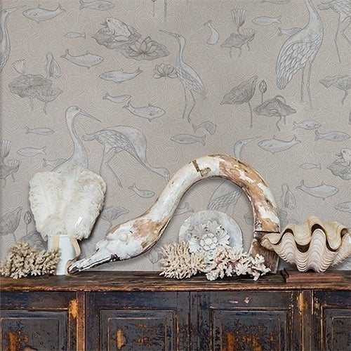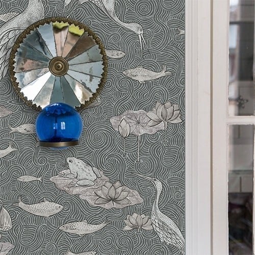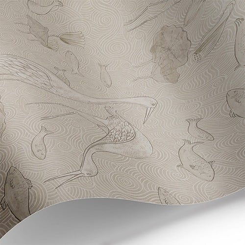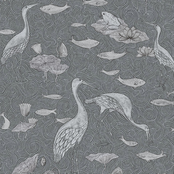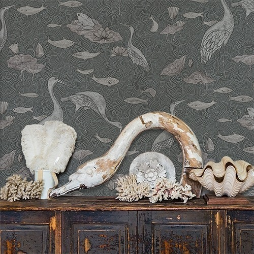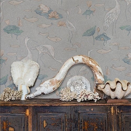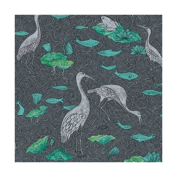 Le papier peint Enchanted River illustre la scène fascinante d'une rivière peuplée de hérons, de crapauds et de poissons. Avec ses lignes sinueuses, la surface de l'eau est stylisée à la manière des estampes japonaises. Des nénuphars complètent la composition, insufflant une ambiance sereine et décontractée.