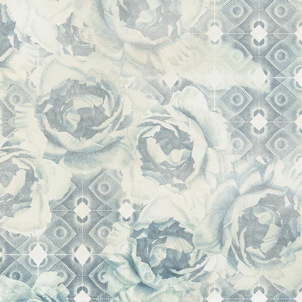 Pour présenter l'élégance de leurs corolles, Tres Tintas dessinent un bouquet de roses sur un fond tapissé de formes rhomboïdales. Pour y apporter un effet de contraste, un treillis de losanges clairs vient illuminer la surface du revêtement mural. L'ensemble du motif met en avant le raffinement et la beauté des pétales.