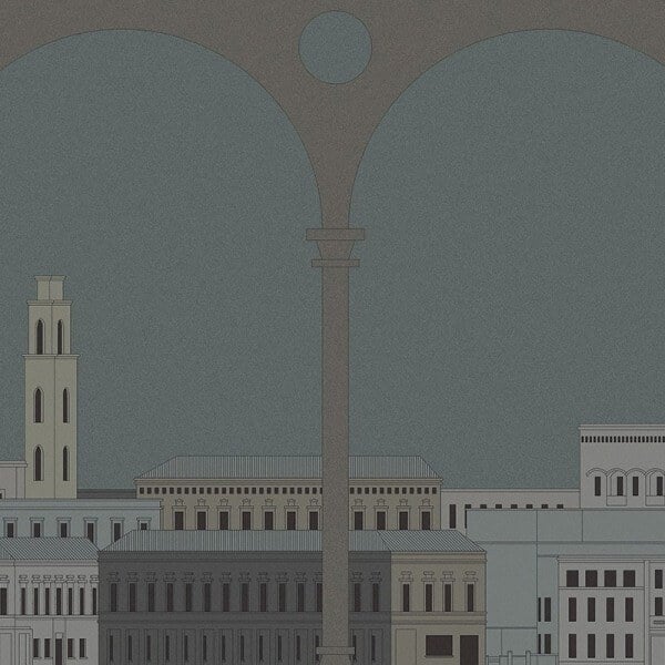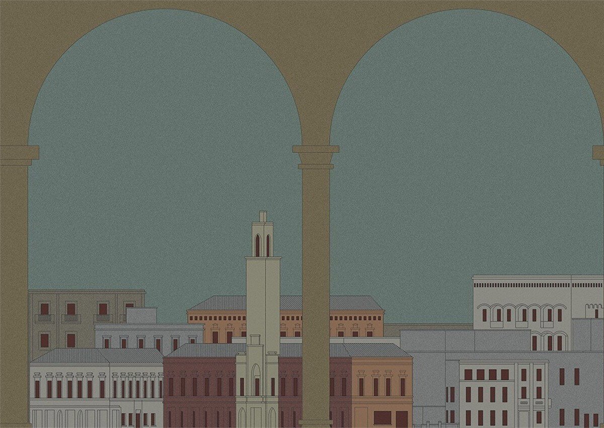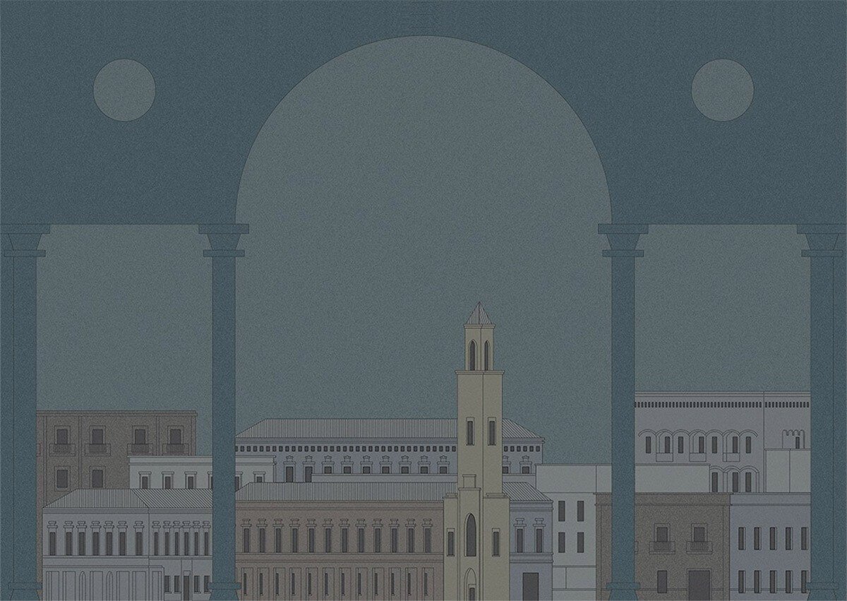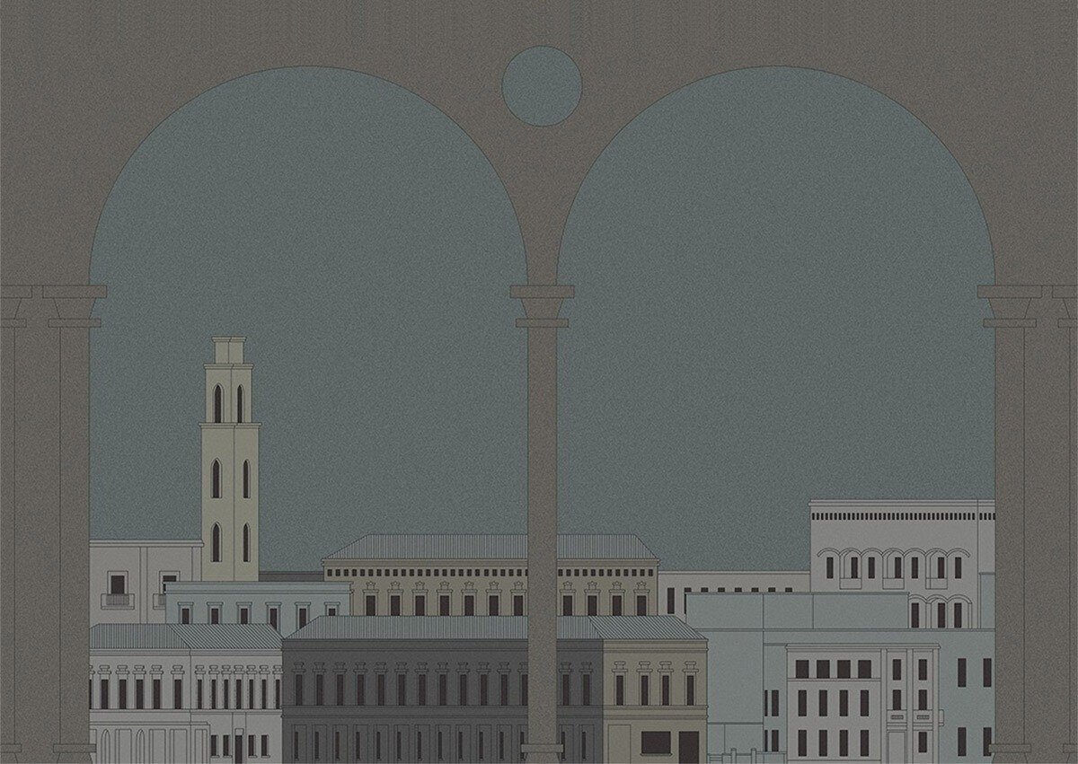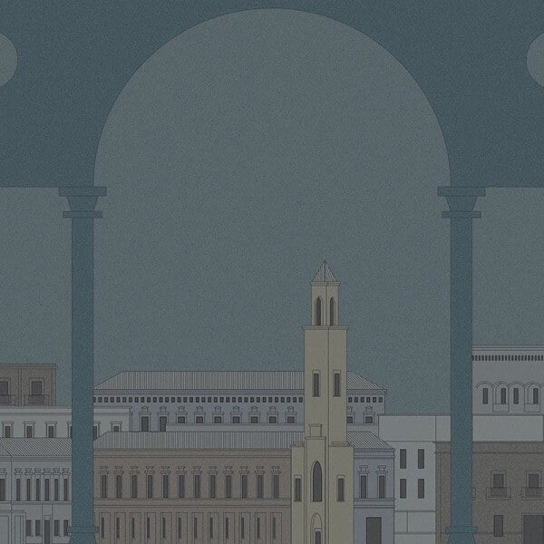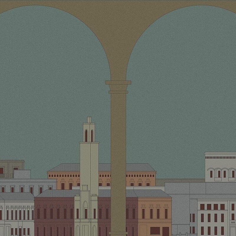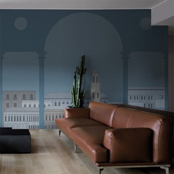 La cité idéale, selon les designers italiens Bellavista et Piccini, se profile sur le motif du panneau Le Città Ideali. Dans des couleurs douces, ce trompe-l’œil évoque la structure bidimensionnelle de l’art byzantin et pré-Giotto. Tout en restant chez soi, on se laisse aller à la rêverie en s'imaginant sous l’arcade en train d'admirer ce paysage urbain.