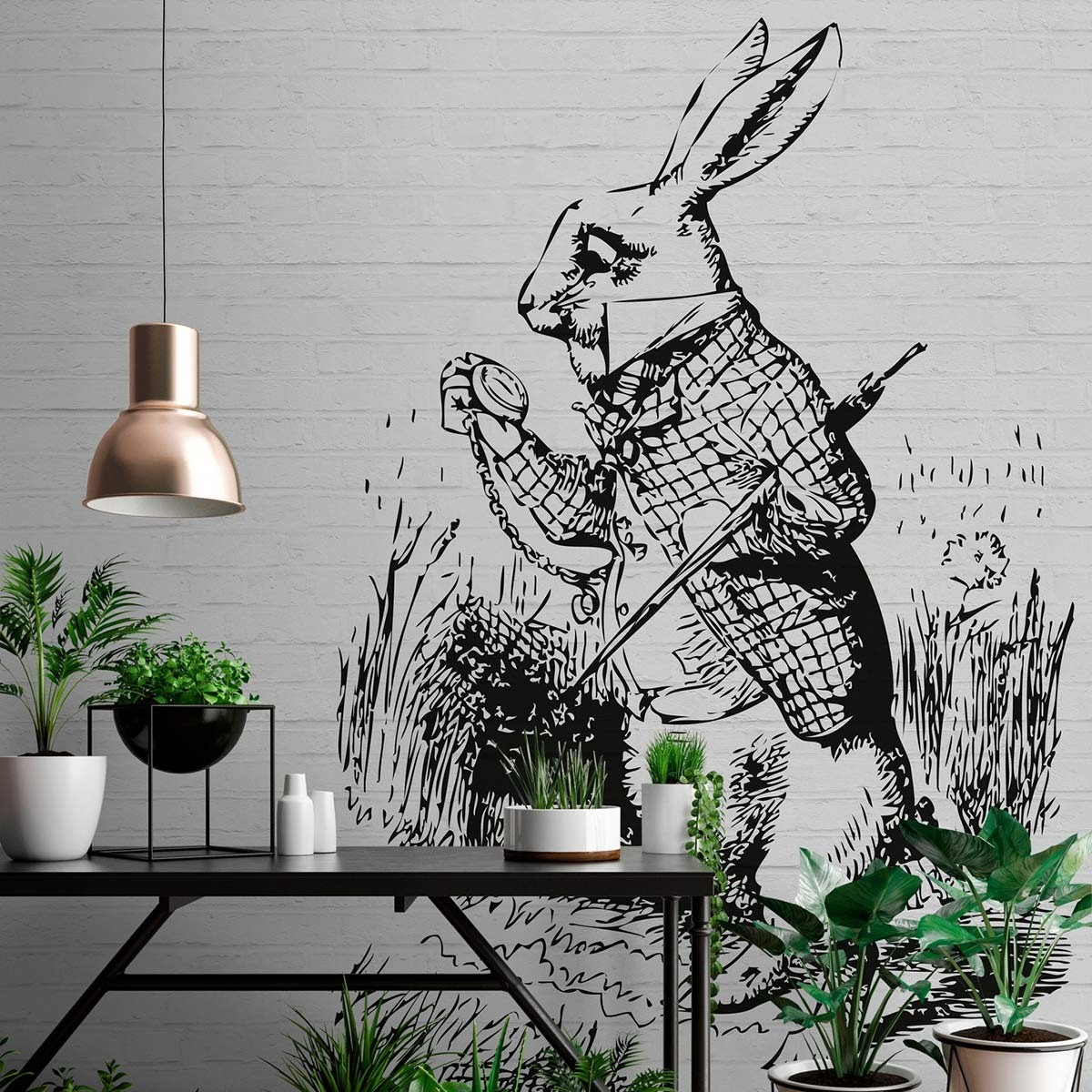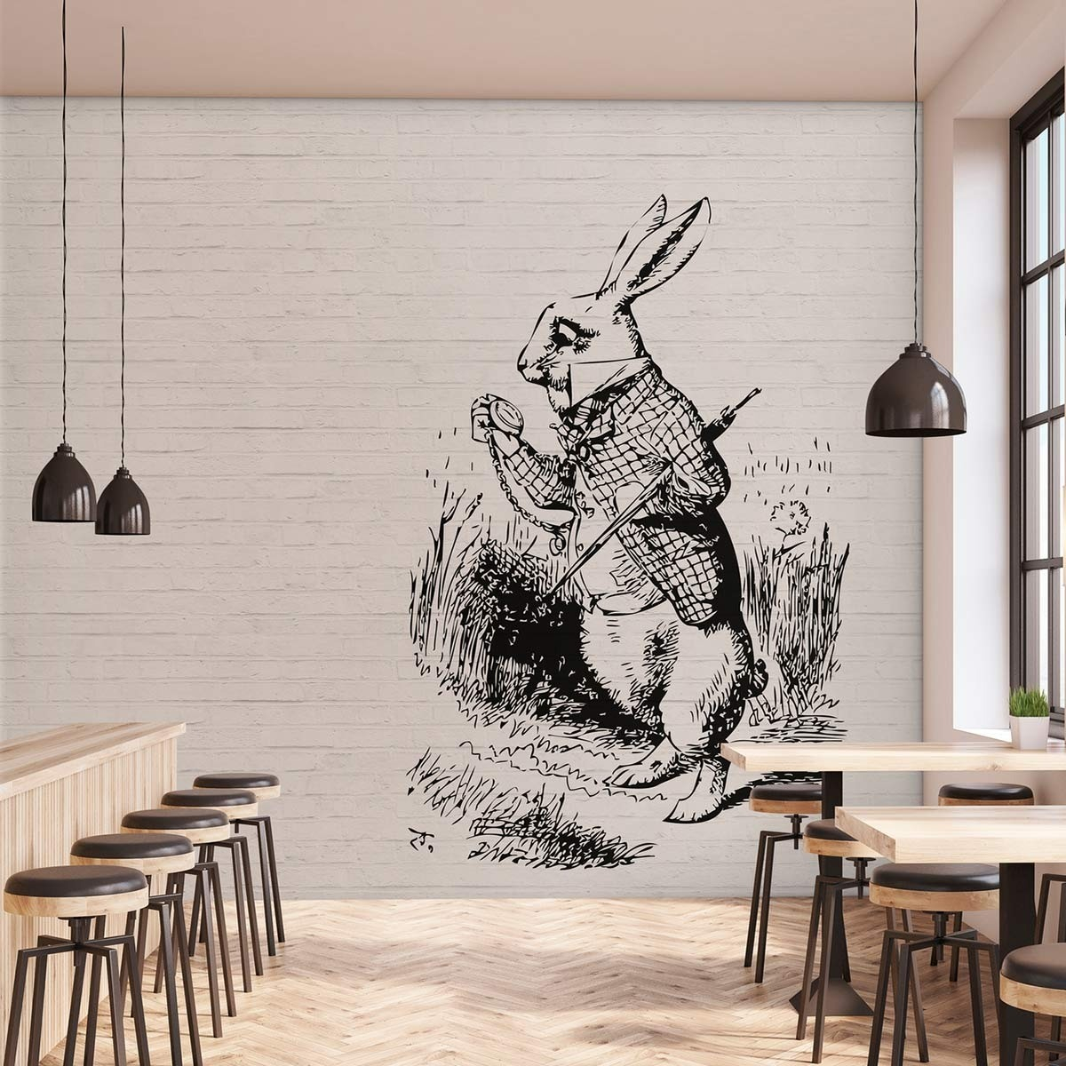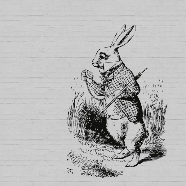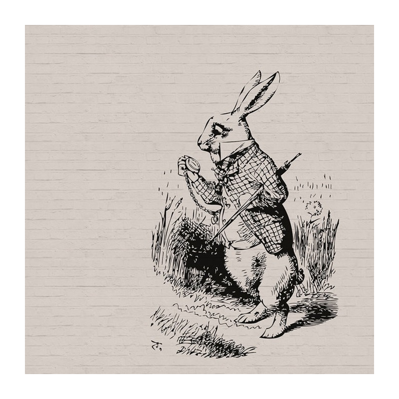 Walls by Patel reprend une illustration du livre « Alice au pays des merveilles » pour concevoir le panneau Bunny. Un lapin vêtu d’un gilet et tenant un parapluie observe sa montre à gousset. Dessiné au crayon à grande échelle, ce design monochrome se profile sur un fond de briques.