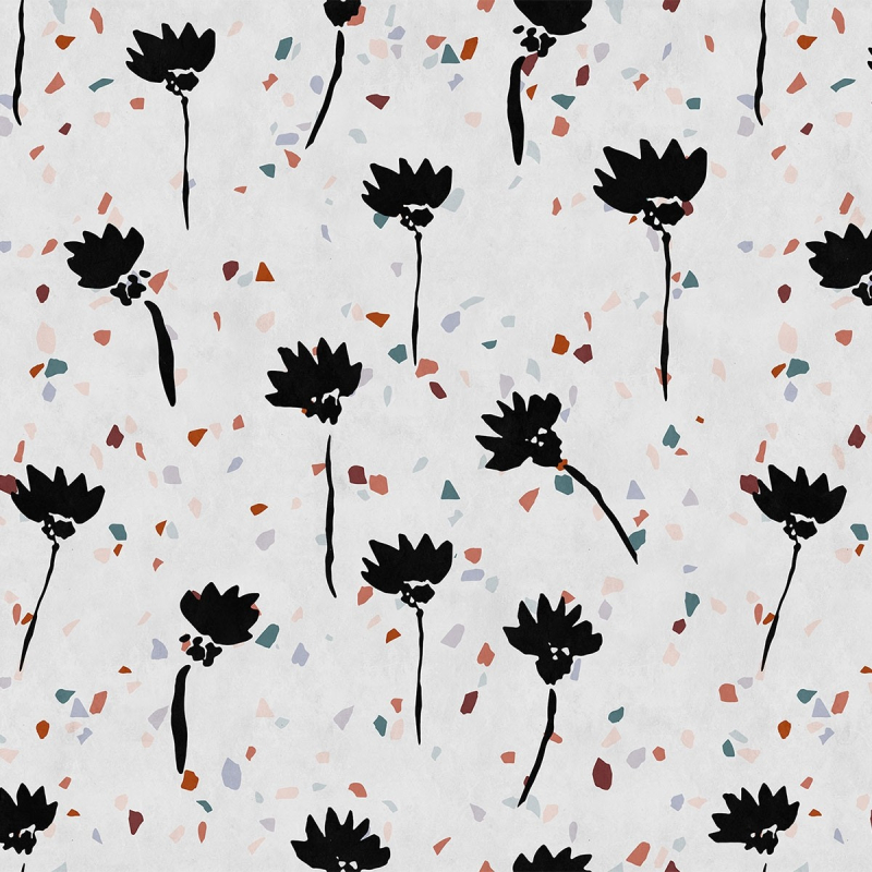 Le panneau Terrazzo 2 fait partie d'une série de revêtements muraux imaginatifs créés par les designers allemands Kathrin et Mark Patel. Son motif met en avant des figures de fleurs dessinées dans une teinte sombre sur un fond de confettis multicolores.