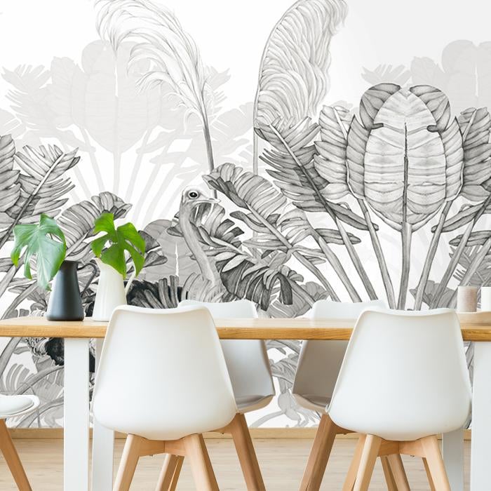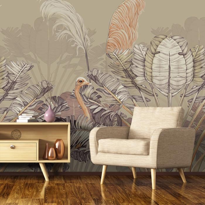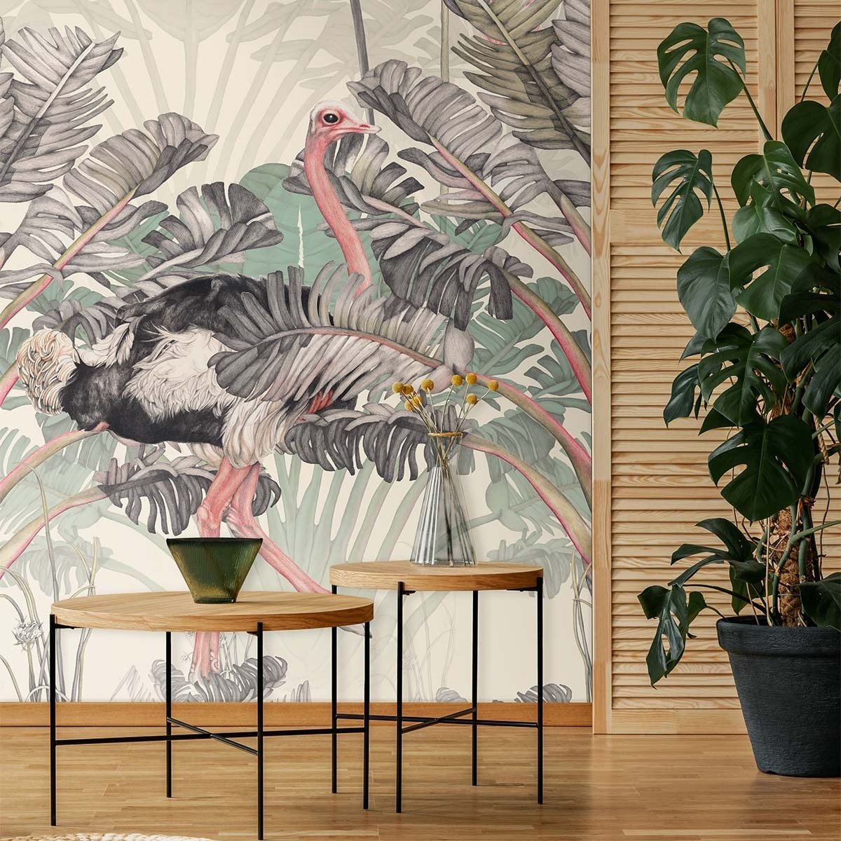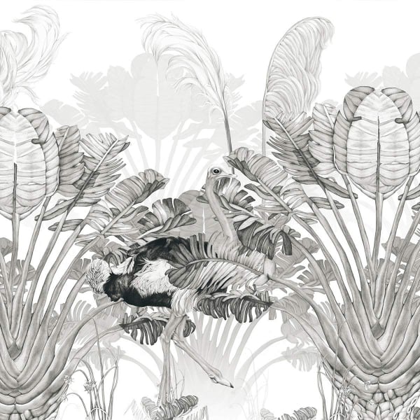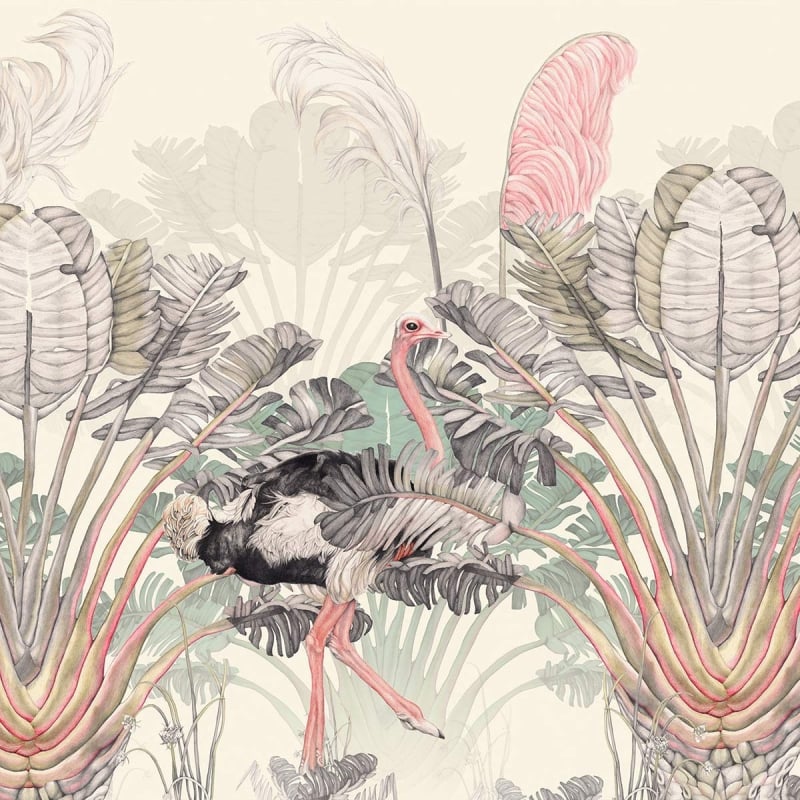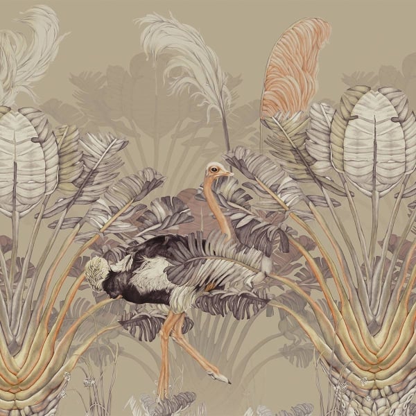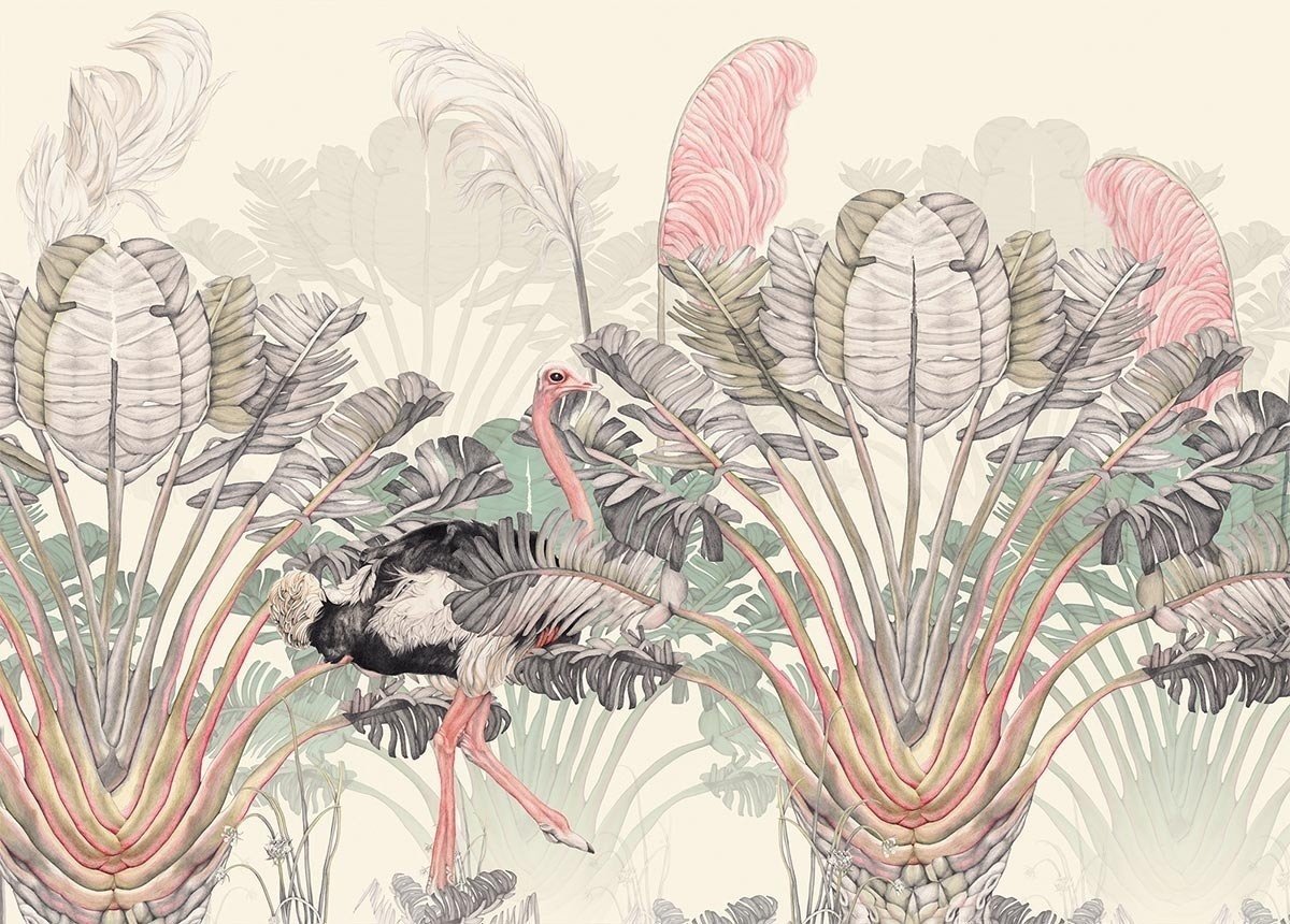 Le papier peint Verso arbore un motif exotique mettant en avant des arbres du voyageur. Une autruche se promène derrière le dense feuillage des ravenalas. Cette végétation tropicale présentée sur un fond uni dispose de détails estompés.