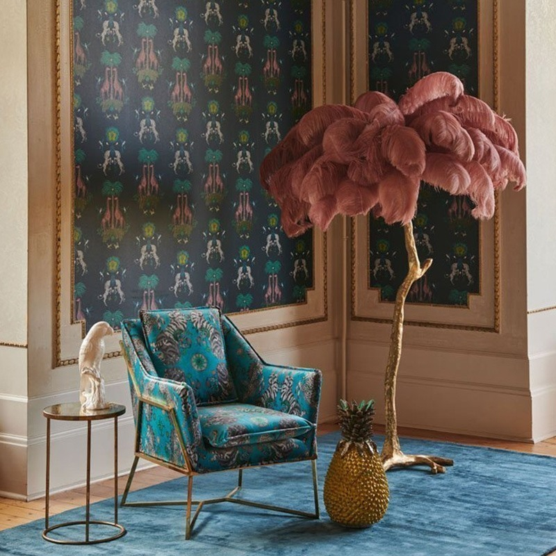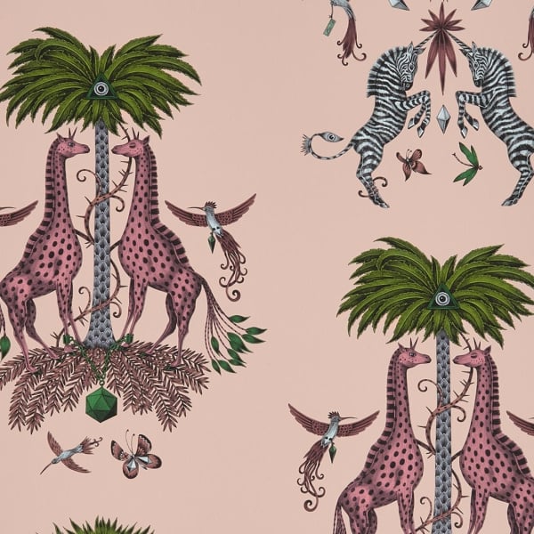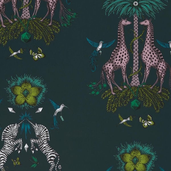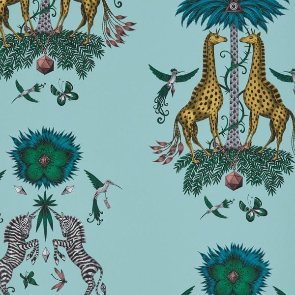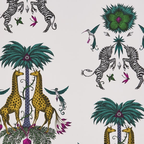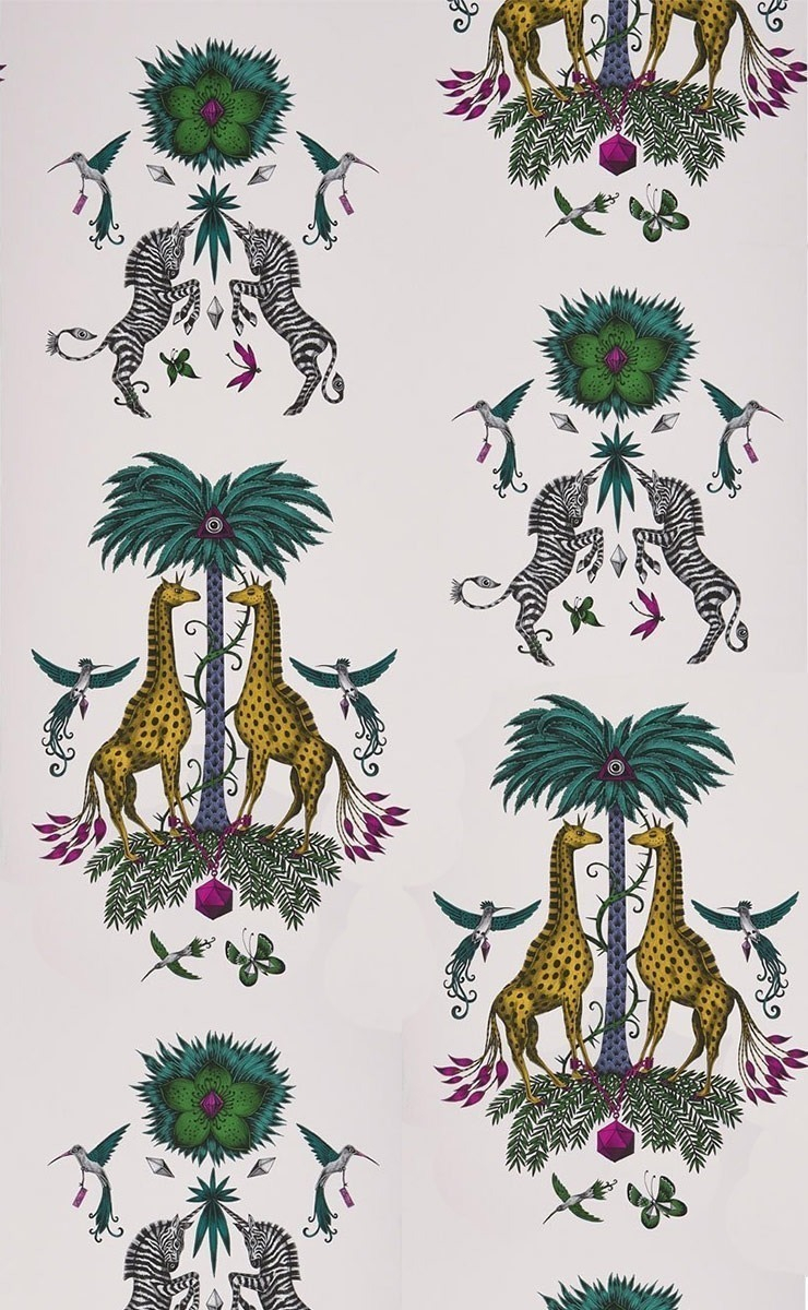 A lot of fantastic animals take place in this wallpaper designed by Emma J Shipley. The artist plays on symmetry and works the patterns like little skits. Nine-tailed giraffes chained to a precious stone on a trunk palm tree with scales surrounded by hummingbirds and butterflies on one side, unicorn zebras, towering flowers, birds and dragonflies on the other. The dreamlike colors of these drawings transport us to a new universe.