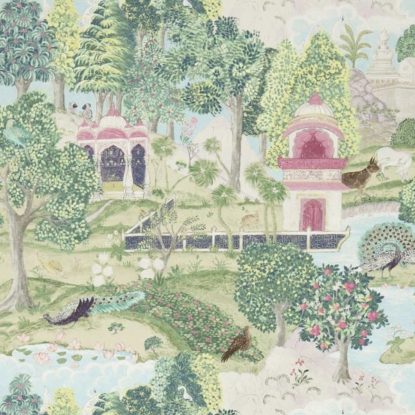 Le panneau Peacock Garden illustre un jardin indien luxuriant. Son motif panoramique présente des animaux et des oiseaux entre des arbres et des pagodes. Imprimé numériquement, ce design, issu de la collaboration entre Zoffany et la designer Melissa White, garde les détails de l’œuvre originale.