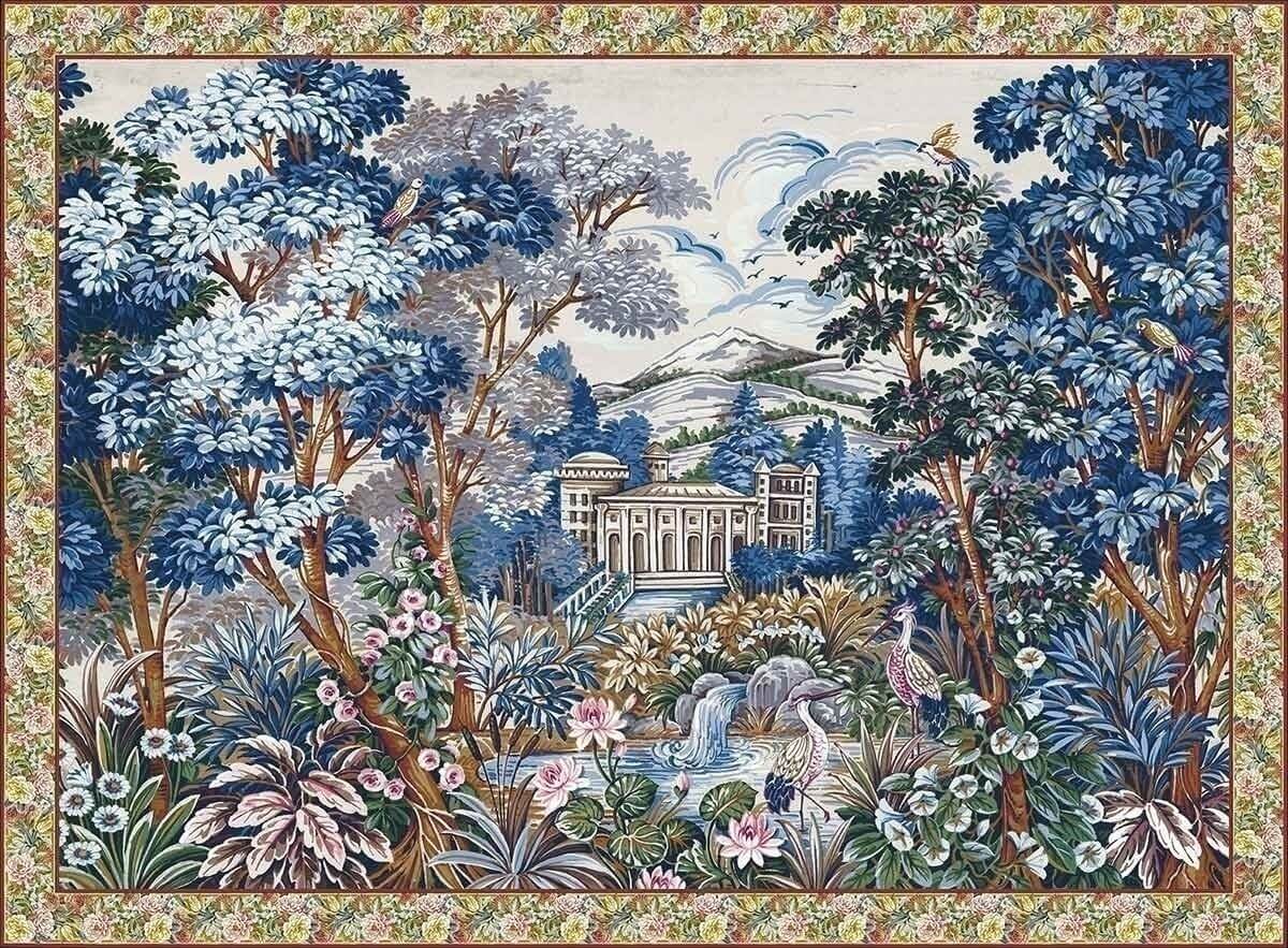 Le panneau Tapestry illustre un édifice entouré d’une végétation luxuriante. Une escadrille d’oiseaux et des montagnes se profilent au loin. Cette création de Coordonné évoque une tapisserie flamande. Elle est agrémentée d’une bordure fleurie.