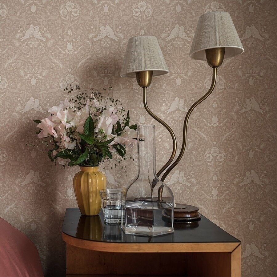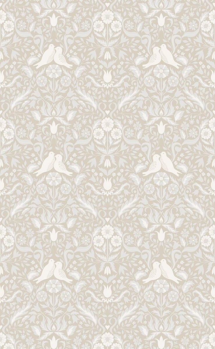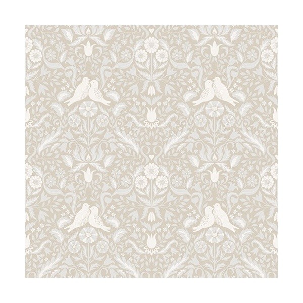 Le papier peint Niki de Tres Tintas offre un motif romantique en répétition. Il présente des couples d’oiseaux au milieu de fleurs variées dans une palette de couleurs douces ou neutres. Les détails fins de ce dessin floral confèrent une apparence gracieuse à l’ensemble.