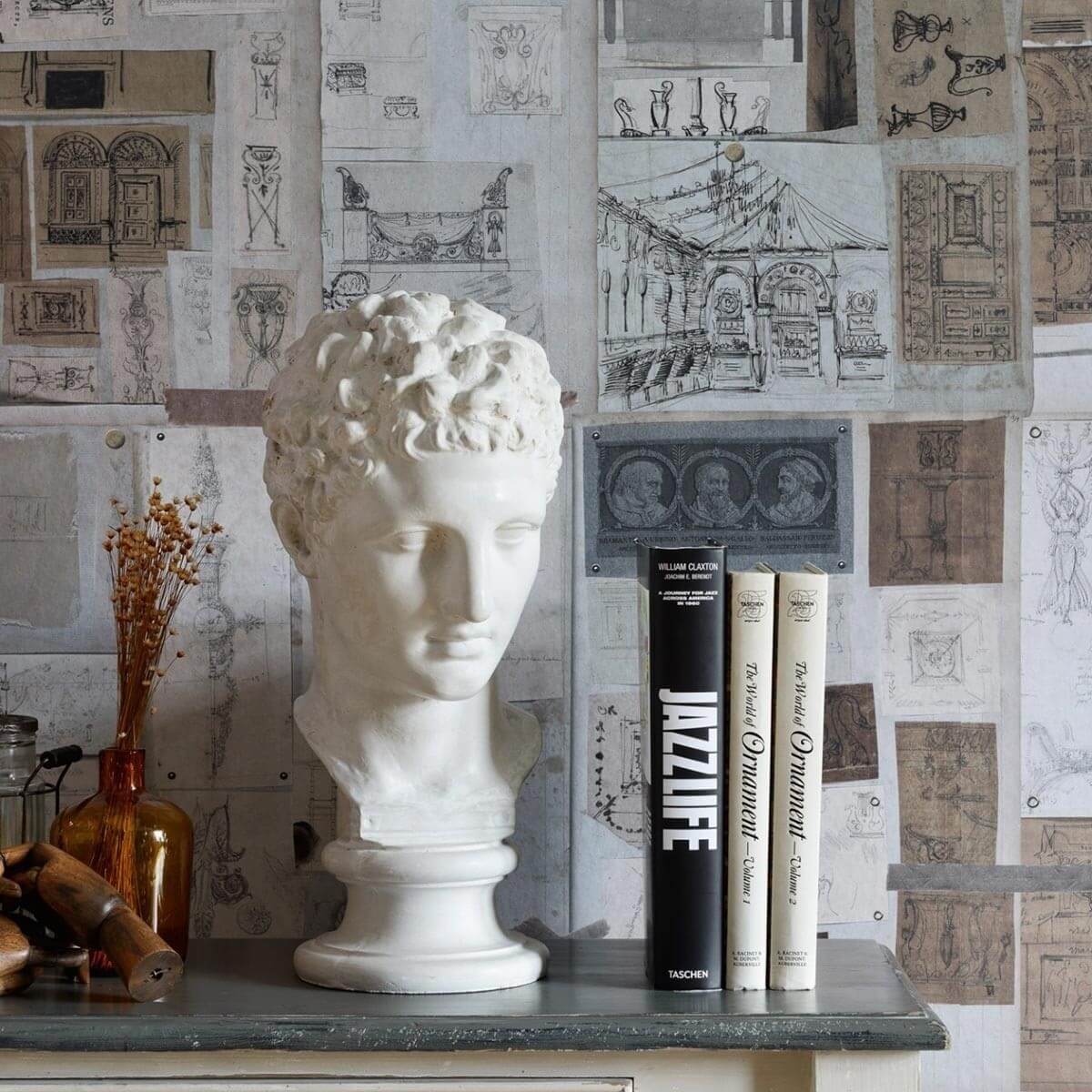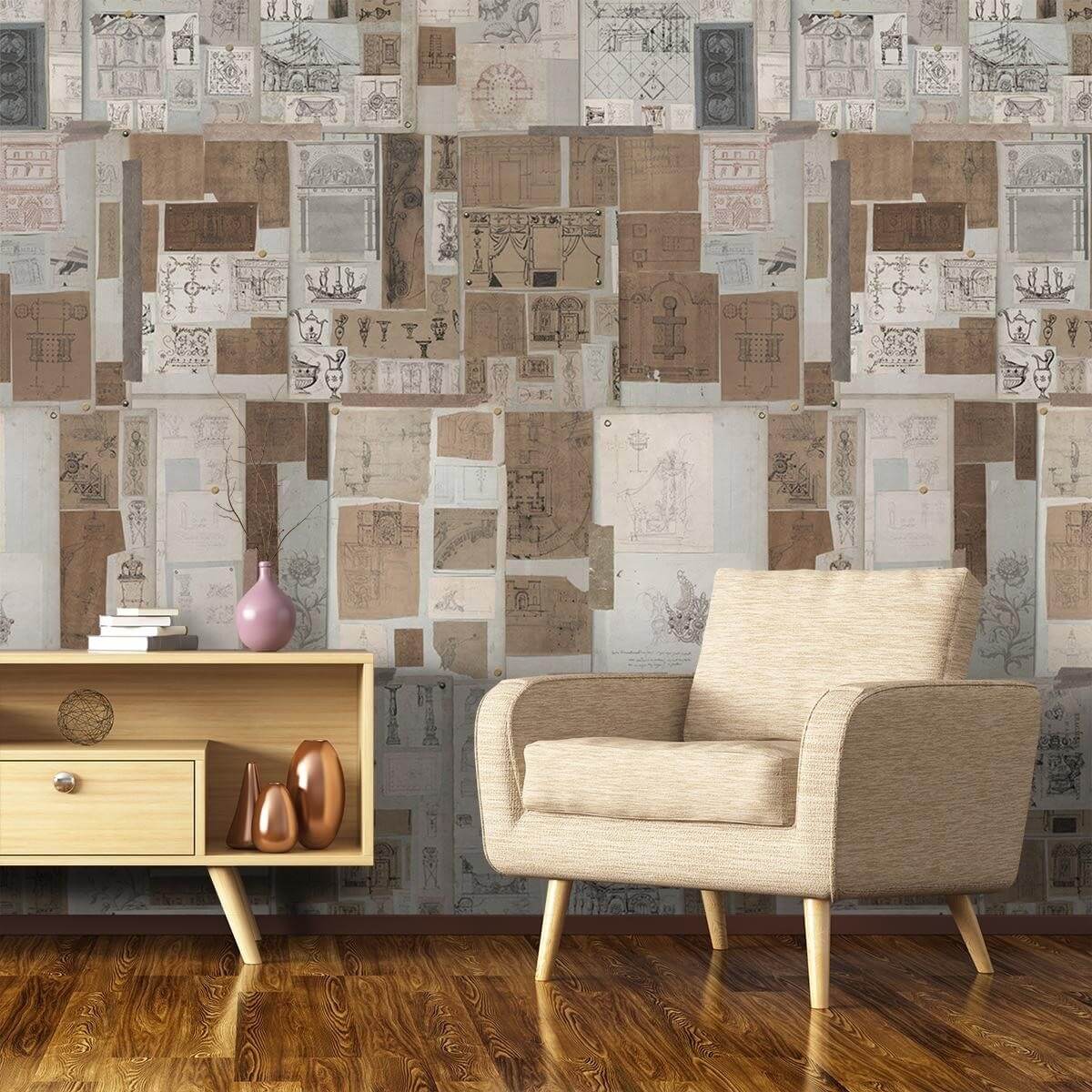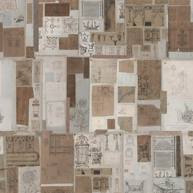 Le panneau The Sketch Book présente une accumulation de croquis, originalement réalisés sur du papier par l'artiste français Charles Percier. Ils mettent en avant des esquisses architecturales et monochromes. Conçu par Mindthegap, cette décoration murale trompe-l'oeil est issue de la collection The Home of an Eccentric Man.